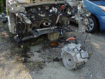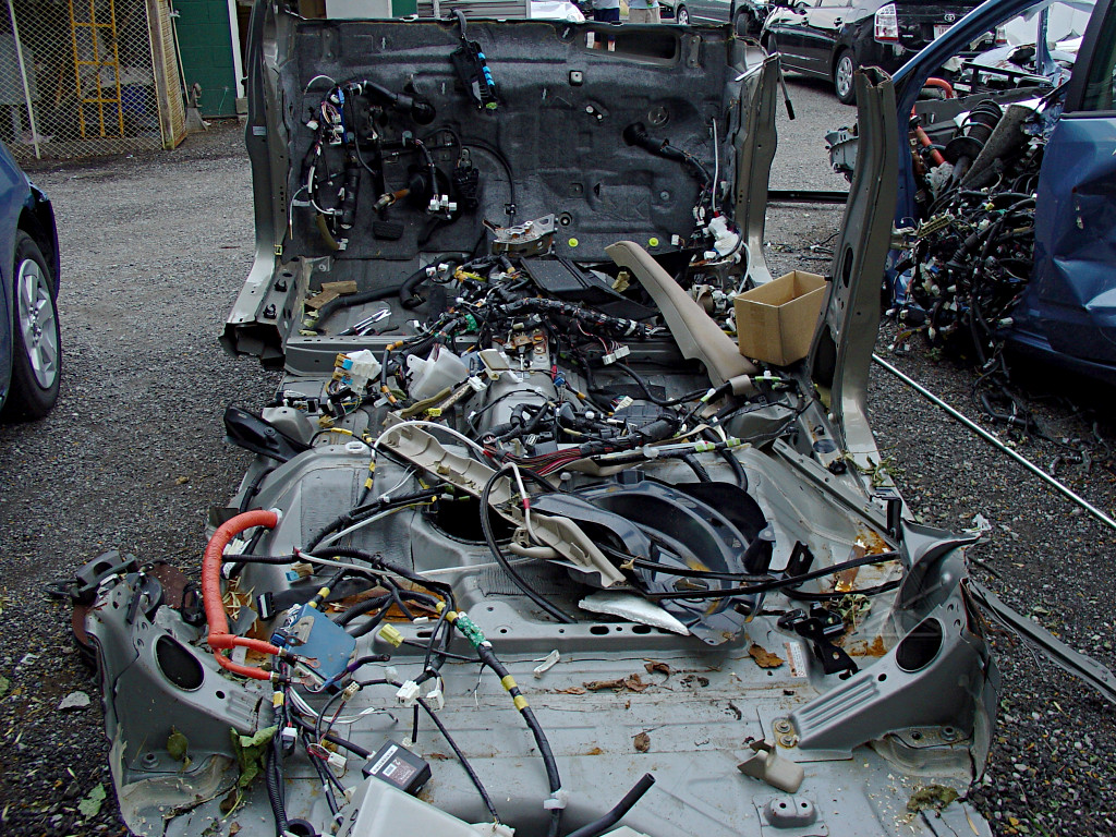 Many of the cars have been picked fairly clean by now -- not just removable components, but large sections of body metal as well. A high proportion of putting wrecked Priuses back together is bodywork, which involves grafting still-good parts of cars into other cars and making all the sheet metal match up. I'm still not entirely sure how this is done, but it was clear that substituting things like the front ends of subframe rails is pretty common since that's what gets bent up in a frontal. Along with that, there are many good components to be taken off the wrecks and tested and organized. Here's one with relatively little remaining, but there's still a bit of work to do on it. Possibly a good transaxle in front of it albeit with bent axles; it would be worth checking the CV joints and half-shaft seals carefully and inspecting the resolver and temp-sensor connectors which always seemed to get busted up in collisions. And checking for water inside.