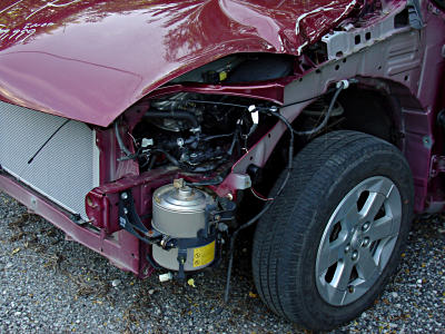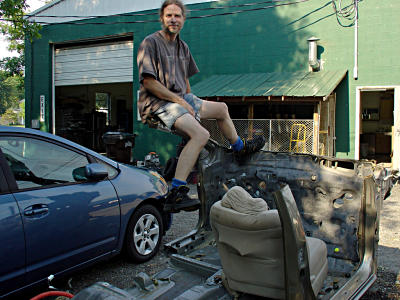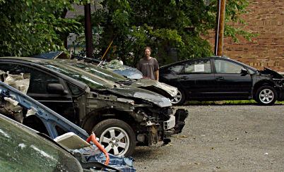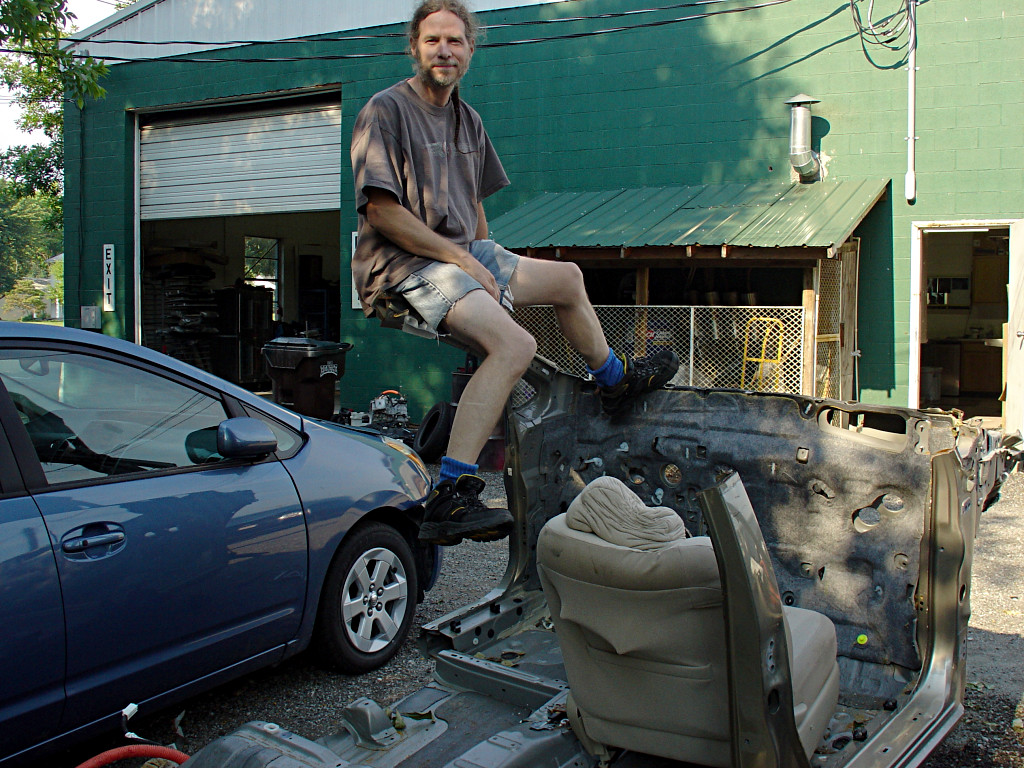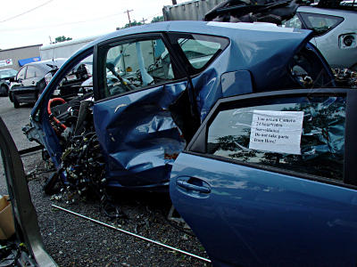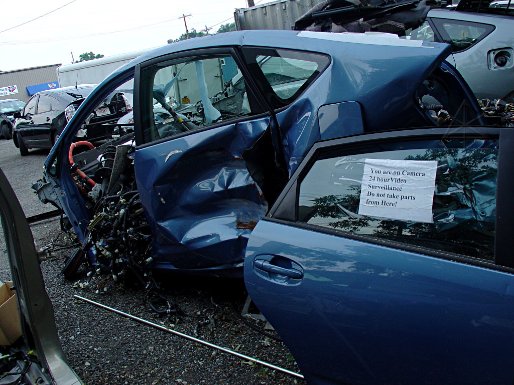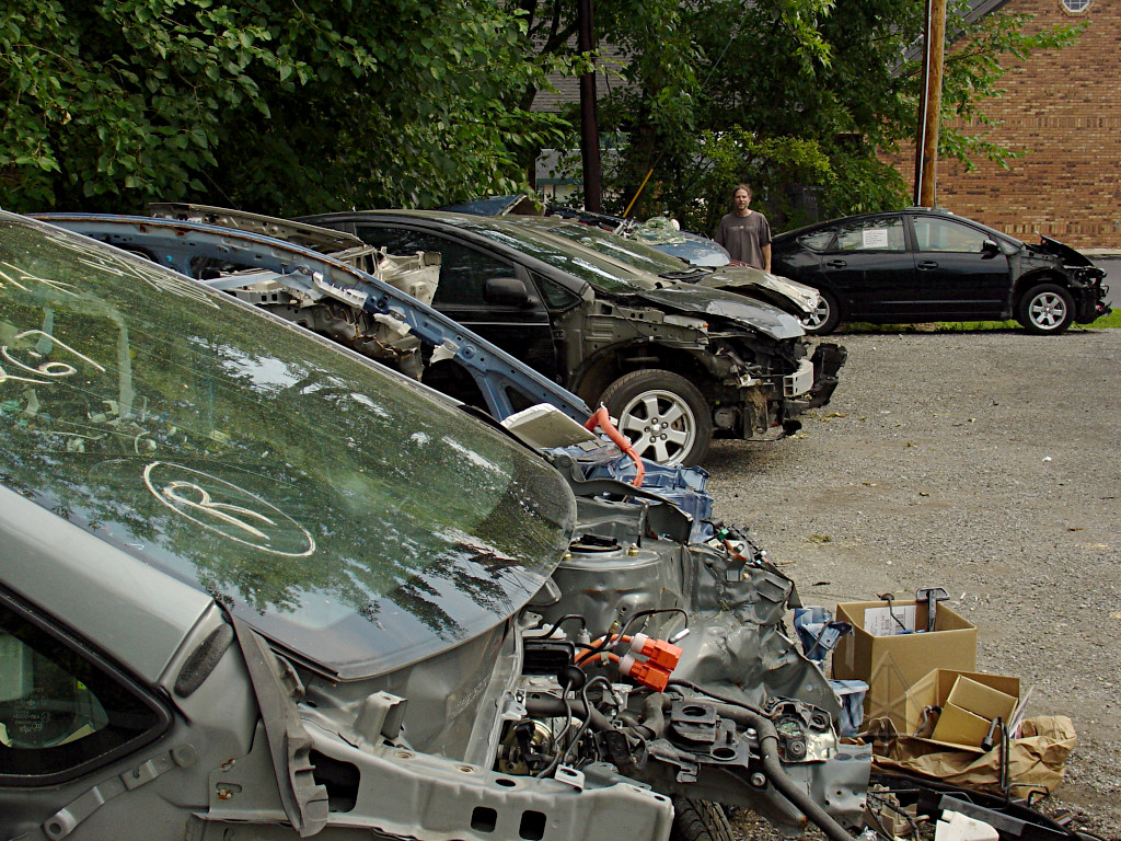After breakfast we headed up to his workplace, and I found myself in his back lot contemplating the row of Priuses in almost every conceivable state of disrepair. Everything from minor fender-benders to almost unrecognizable balls of crumpled metal.