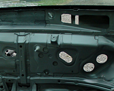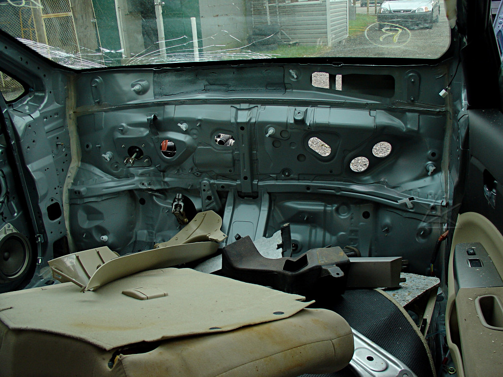 Back out to the yard for a look at a few more things. This is what the firewall looks like when completely stripped of everything attached to it, including the fiber sound dampening mats. Here it's easy to see what the inner intake opening into the A/C and heater box looks like, and why it would be difficult to install a piece of rodent-proofing mesh over it from outside -- because it's more than half blocked by the outer cowl piece and it's all firmly spot-welded in place. To do that job right you'd have to pull the whole A/C and blower unit -- which Steve has done during teardowns, of course, but not what your typical shadetree owner is likely to tackle. It's much easier to try and remember to leave the system in "recirculate" when shutting down, to avoid having decaying mouse parts flying out of the ductwork when the fan starts up.