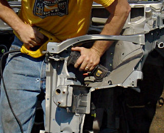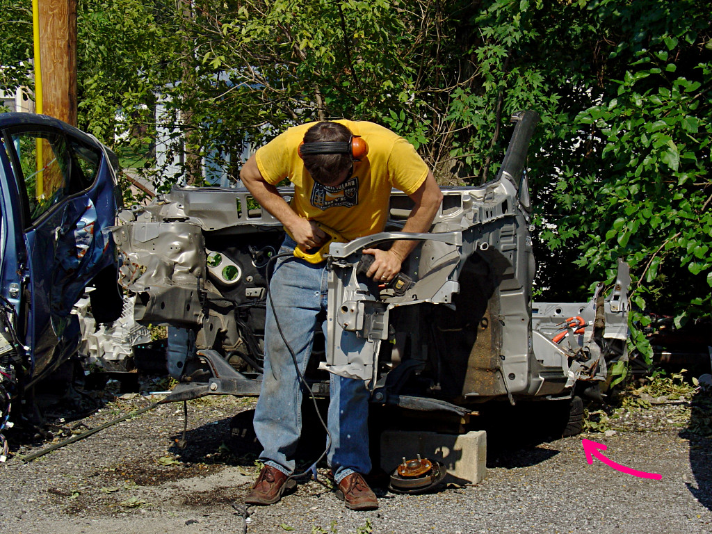 This is what happens when you give guys like this power tools... after pulling the crossmember off to save the non-bent lower arm and free up the battery cables, Steve looked at the subframe piece that connects to the bumper, said "that's worth saving" and went to work. This is how he collects so many Prius pieces that he can use to restore other cars to non-crunched condition. I was amused to note that the rim supporting the hulk [pink, lower right, big picture] had a Hydroedge tire on it.