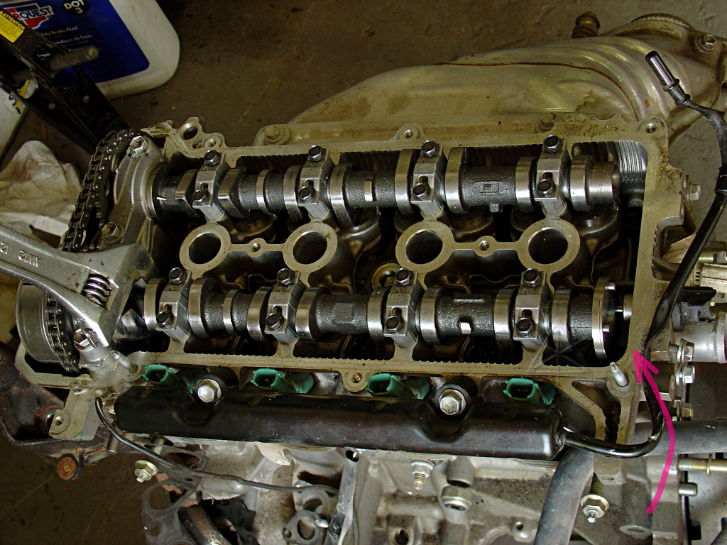 and where the cam sensor is at the same rotational position. This is at full valve *advance*, and the sensor pin seems to line right up with the center of the reluctor. Any more retarded position places the cam slightly more, uh, clockwise as we're looking at it here. While the cam sensor may match a sensible position at TDC, recall that the crank does not, but this may help determine more about the relationship that the ECM does its calculations from. Easy to see the longer-duration Atkinson intake cam here, and how the bucket lifters fit snugly into little guide channels underneath.