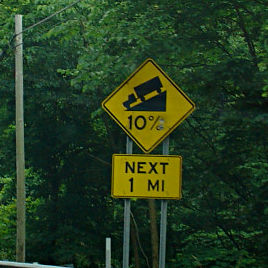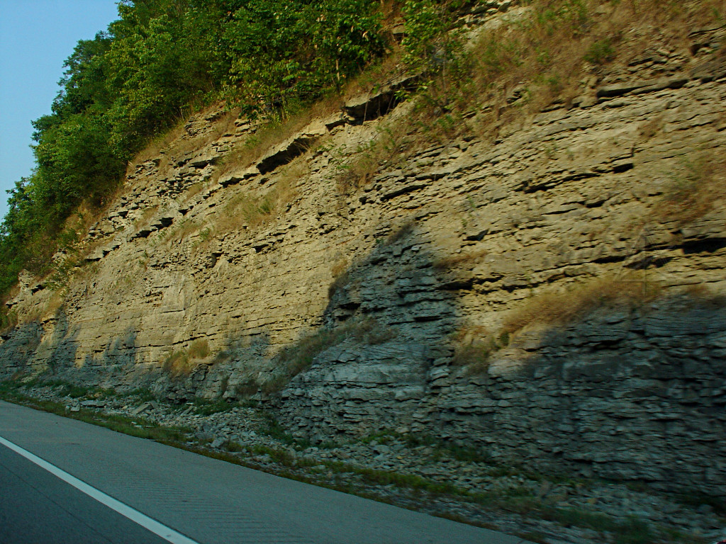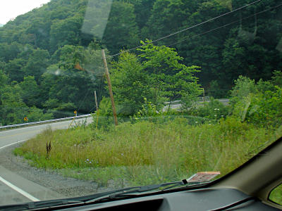 According to Steve, the IN/KY border is around where the ice-age glaciers stopped advancing and left big piles of rock as they retreated. Most of the bedrock seems to be this oddly stratified stuff, which is also ripe cave formation territory. The hills formed by all this segue into the Appalachians farther east, and that's where I was headed. I had planned a tentative route into and through the fabled West Virginia mountains, by looking for the most wiggly highways on the GPS, figuring those would be the ones that wind through the highest hills while still getting me farther east. I made the WV border by nightfall and continued on a little way, and somewhere around the town of Hurricane started looking for a place to hang it up for the night. After threading my way carefully through the maze of "sleeping giants" at a TA truck stop and deciding it was just too loud with all the idling diesels around, I backed quietly into an empty slot behind a Hampton Inn across the street, rigged the curtains, and found that their Wifi covers the parking lot well enough that I could hop on briefly and update the running blog thread.