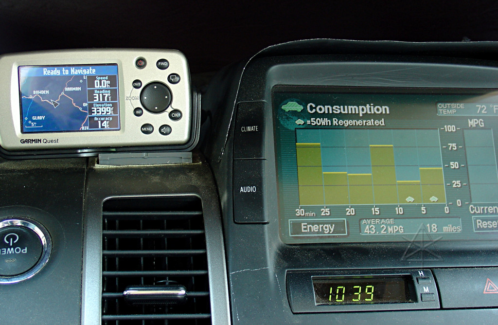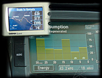 Sure, I could have blasted up the same hills at or over the posted 45 or 50 mph speed limit -- the car's capable of it, but why bother? The Prius generally doesn't bring the battery in to assist on acceleration until somewhere north of 3000 engine RPM. So by holding right around there and letting a *little* pack energy come in to help, I could keep a reasonable climb rate going all the way up without getting too far into serious fuel-sucking territory, and try to regulate things so the pack was largely drained at the crest. I figure that's about 40 horsepower used to climb, which is still a higher power-to- weight ratio than most trucks. What more does *anybody* need, unless they're on some kind of emergency call.
