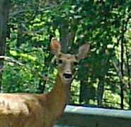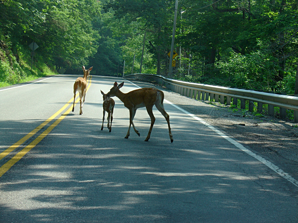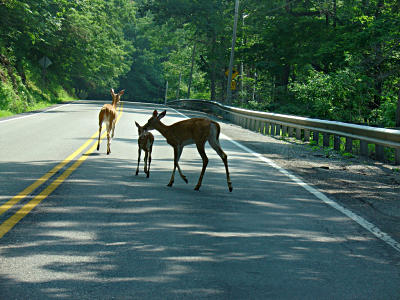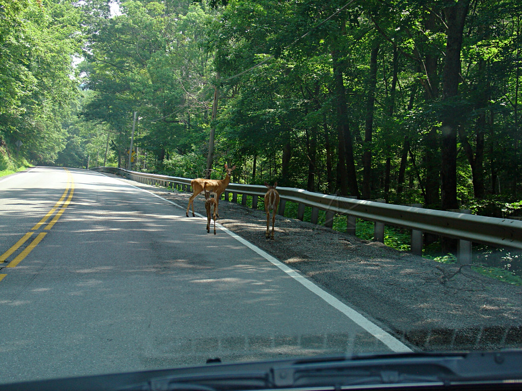 So I slowly chased them along the road under electric-only power a little ways, until they finally figured out that maybe they shouldn't be there. The mom and dad [?] managed to hop over the guardrail and down the bank; the fawn did a clumsy but amusing little squeeze underneath. Meanwhile I was ready on the high-beam lever to warn anyone coming down the other way, and kept half an eyeball on the rearview in case anyone came sailing up behind and needed a shot of the yuppie button to wake up and pay attention. I was nonetheless really glad I was on the way *up* during this encounter, or things may have gone quite differently. And glad that nobody else was coming down at the time either.