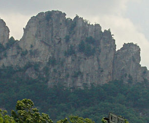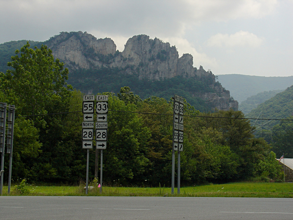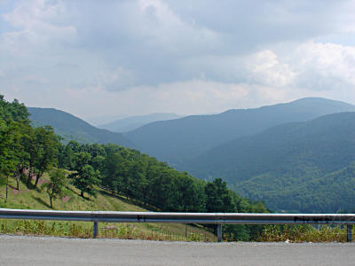 After that set of ridges I found myself at a crossroads near Onego, WV where US33 turns abruptly south. I opted to turn north instead onto Rt. 28, since that heads up toward I-66 more in the direction I needed to go. There is no road continuing truly east from here, and I think we can see why. As I contemplated all this from a general-store parking lot, the same small group of bikers I had seen at a brief stop at the beginning end of US33 rolled in behind me and we chatted a little bit. Even as a cager, I feel a little bit of kinship with the 2-wheel crowd simply because we've all got our own ways of enjoying our vehicles and these folks were clearly having just as good a time on these roads as I was. They can make all the noise for me, though. My excuse for not riding these days is simple -- it turned out that my car was getting better mileage than my ol' 350 enduro putt-putt, so I eventually sold off the scoot!