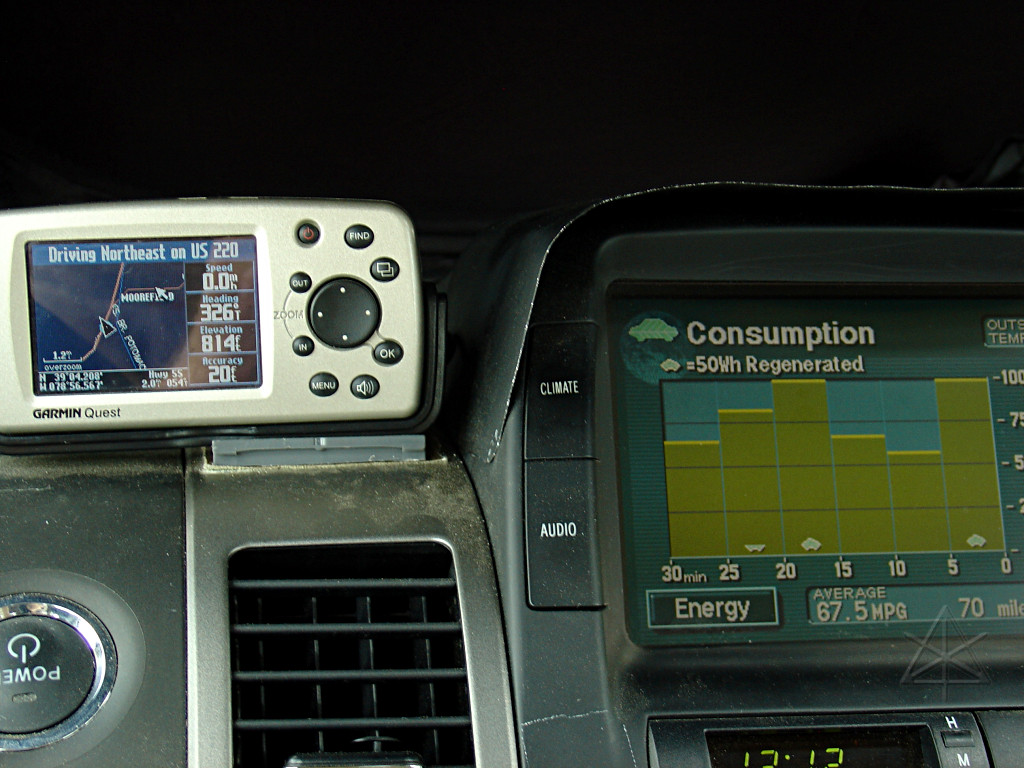 As 28 followed the valley northward and merged with 220, it yielded some really long, beautiful engine-off glides while descending back down to a more reasonable 800 feet ASL. "Now that's more like it!" I thought while noting the recovering-and-then-some MPG average. In general, using a fairly consistent driving methodology of staying within 2000 RPM plus or minus 300 with the abovementioned excursions and grabbing as many warp-stealth and other no-fuel opportunities as possible, the MPG average seemed to stay very closely and simply tied to *altitude* over the entire trip. Maybe just a wee bit better overall on the return leg due to prevailing westerly winds. Soon I dropped onto I-66 and continued on toward DC and the house of an old friend who'd just recently bought a new Prius.