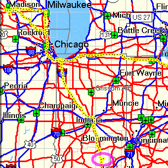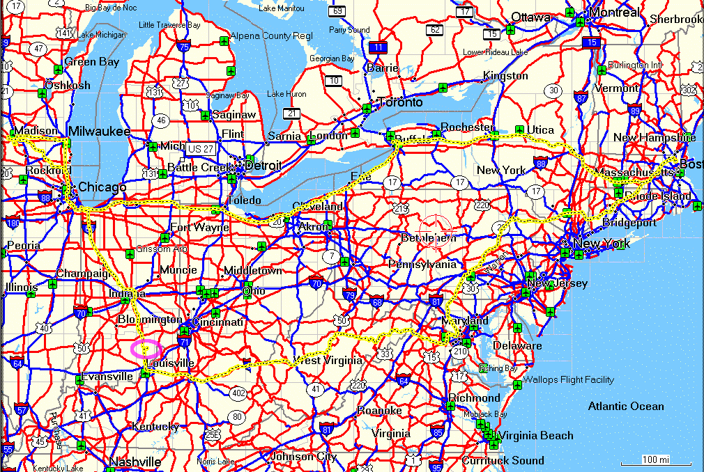 Here's the whole loop -- 2950 miles or so, in yellow. The little pink oval is about where Scottsburg is. Fillup average over 5 tanks was 61.7 according to the car, or right around 61 MPG taking my known +1.2% Hydroedge distance factor into account. Try *that* in your Winnebago...