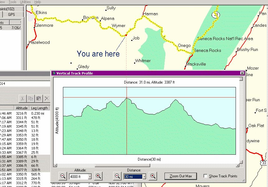 Past here the road becomes even more wiggly on the map, and rightly so, as I got into a long climb up over the ridge east of Elkins. Note the elevation here, helping explain why my fresh tank average rapidly descended into gas- guzzler territory despite taking it easy and simply thumbing the occasional pickup on by who actually *wanted* to make the climb at full throttle. But even the minor MPG hit was well worth the view from the top: