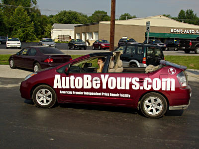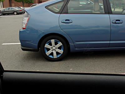 On one of our jaunts out to the fish store [she has way-cool saltwater reef tanks] we spotted another Prius with an interesting color scheme on its trim rings. Almost like the owner had seen this photochop and had decided to experiment, but in the car's own color instead of black.
