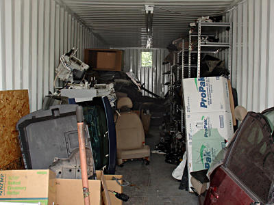 Many of the recovered parts get stored into a lockable container or shelves in the shop, labeled as to source and any knowledge of condition. The trailer has 100% solar powered lighting -- panels on the roof and a 12V battery and inverter for the overhead fluorescents!