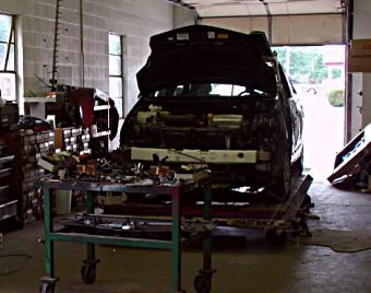 The shop is sort of a long single bay, with the most prominent equipment feature being the alignment rack. No lift yet, but that's probably coming soon. The car up on the rack that morning had apparently been rolled, and had probably high-centered on a ditch edge at speed before going over because there was lots of dried mud packed into almost everywhere under the front and a clear pattern under the crossmember of having slid diagonally across dirt.