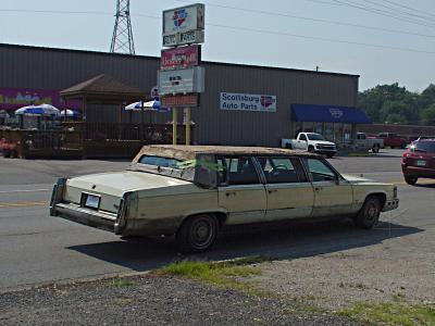 Steve's vehicle collection reflects how he's spent a long time doing the buy, fixup, and resell game with many different types. This monster, for example, had been in a fire in the surrounding building where it was parked, which pretty much toasted the landau top and blackened the entire exterior. But since the car was closed tight and the fire hadn't been that hot, nothing on the inside got burned or even smoked up -- while I could smell smoke around the exterior, I couldn't detect anything on the inside velvet upholstery -- pretty amazing, when you think about it. The car still runs, and basically just needs new trim, more cleanup, and a paint job. So while I was there Steve sold it to his nephew and buddy who were looking for a large vehicle for their band's gear, and here they are happily tooling off in their new acquisition. [Cue the "Peter Gunn" theme...] On the second day I was there, Steve also won a salvage-yard auction on almost the inverse case from the limo -- a large motor home that had had a furnace fire *inside* which charred much of the interior and put a big hole in the roof, but remained otherwise functional. A couple of days after getting back on the road, I got mail that he'd picked it up and driven it back to the shop. So that's going to become another big ol' project!