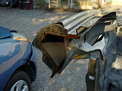 The cross-section cut of the A-pillar on this one reveals some interesting construction details. Most of the major members have vibration-deadening foam layers stuffed in. The thicker steel in the middle is the special hardened stuff that forms the occupant protection cage, and Steve says it's very difficult to cut. Now, note that this particular member is the piece that passes most of the way over the driver's window but the B-pillar is gone, and the remainder is only attached to the rest of the hulk at the front end by the two pieces that bracket the little triangle window. Still, it felt *very* stiff, so I figured I'd give it a little stress test.