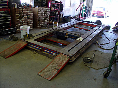 The rack normally sits up on large casters, so the entire thing with a car on top can be pushed around the shop. It's basically a very stiff, strong flat frame onto which various hydraulic clamps can be attached to pull, push, and hold pieces of car bodies very firmly. There's a large air-powered scissor jack in the middle that can slide back and forth, so it almost works like a lift too. Later on, Steve jacked the front of the whole rack up [to remove the casters] and then down onto a couple of 4x4s, sort of like kneeling a camel, to attach the little ramps and swap that car off the rack.