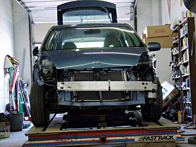 Next up was this one, which came with sort of a sad story -- a car that Steve had fixed the front end of and sold to a local lady, who later got in an accident that knocked the whole front end askew *again*. The little side benefit is that Steve got to see his welding work seriously stress-tested, and found that it held up fine. But the bumper is clearly offcenter and the radiators are probably toast. Steve says that for these wrecks that look like a hopeless mess even if relatively minor, one should just break it down piece by piece and evaluate it one thing at a time, to avoid stressing about the whole job. We had taken some of the morning to disassemble the nose of this one, and I found shreds of someone else's tire embedded in the chewed-up end of the aluminum bumper piece. I was all set to take that off too, but Steve wanted it left on as a straightening/spacing guide between the two rails. The car still ran well enough to make the short trip onto the rack under its own power. Steering was a little squirrely, and a close look shows that there's way more toe-out than just the picture's perspective.