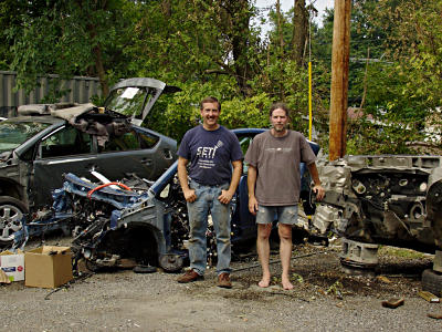 While I could have stayed on the rest of the week, or maybe the summer, I started to feel a pull back toward the road and I'd already lined up my next major waypoint in the DC area. So it was time to get rolling again; I used the second evening's opportunity of Steve wanting to have family time to take my reluctant leave and planned to get as far east as I could that night and then explore some backroads on the way into Virginia the next day. Before parting, Steve wanted a shot of both of us amid the tangle o' Prius. I'd had a seriously good time here, and I know there's a lot more I could still learn from him and what he does. I'll never look at Prius body parts quite the same way again, that's for sure.[For the record, I did wear work boots during most of my stay