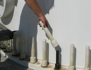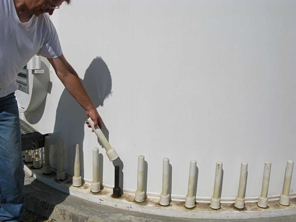 It's pretty amazing that the narrow footprint of what holds the tower down to its base doesn't get overcome by the axial load against the turbine with such a huge lever arm up into the air. But this is all there is to it. All the hold-down bolts have a heavy coating of grease and then these little weather condoms put over them, to discourage corrosion. This seems vulnerable to theft and vandalism, and the guys said that to their knowledge people weren't messing with the windmills too much at this point but that might change as they became more common and mainstream. I suppose most of the installations will need little fenced-off corrals around each base like they do with radio towers, especially if they're in livestock fields. With a data network already linking everything up it wouldn't take much to add a couple of infrared-enhanced webcams to help catch miscreants. |