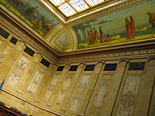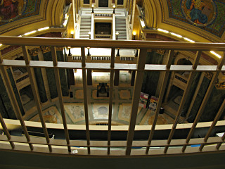 More of the nice central-vault detail, in a style mildly reminiscent of the Newport mansions I visited earlier in the year but a little less baroque. The side hallways lead to offices on multiple floors -- offices of senators and other officials, many doors wide open, and again completely unrestricted to the public. I could walk along and hear phone conversations going on, and hardly anybody even looked up when I passed their doorways. I guess they're used to wandering tourists. |