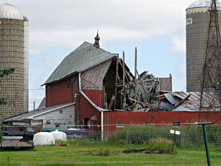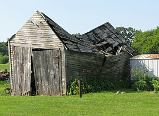 This was along the way, and I had to run a ways out into a field to get the right angle on it. This looks more like storm damage than decrepitude, but it still captured my eye from the road. |