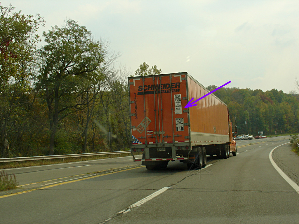 Possibly the most terrifying encounter of the whole journey. Most Schneider trucks I see are perfectly courteous, but this numbnuts must have been on a really bad day -- he screamed up behind a small pickup truck that was behind me in the final few miles of US 6 in PA, thus pushing the pickup toward me and requiring repeated requests to back off. The pickup was trying to, but Schneider here was so close behind him that it was difficult and really not the pickup's fault. Note that this was all at an average speed around the posted limit, so it wasn't like I or the pickup were impeding any progress. Hell, I wanted to get home too. When the road finally opened to four lanes the Schneider truck jumped abruptly over and blasted by both of us with turbo a-screamin', and rapidly vanished into the distance at well over the posted speed limit. Called in a few minutes later after I could stop. Required a little detective work and help from a nearby motel's phone book to determine Schneider's number, since it was *obscured* off the back of the trailer with spray paint or something. The number we looked up happened to reach the local dispatch handling this truck, rather than some huge national office, so they were able to deal with it immediately. The motel desk people were very helpful and concerned, and actually knew that there was the local Schneider office in the area. I really hope this asshole got pink-slipped that very afternoon, and then laughed out of the JB Hunt human resources office just to rub it in.