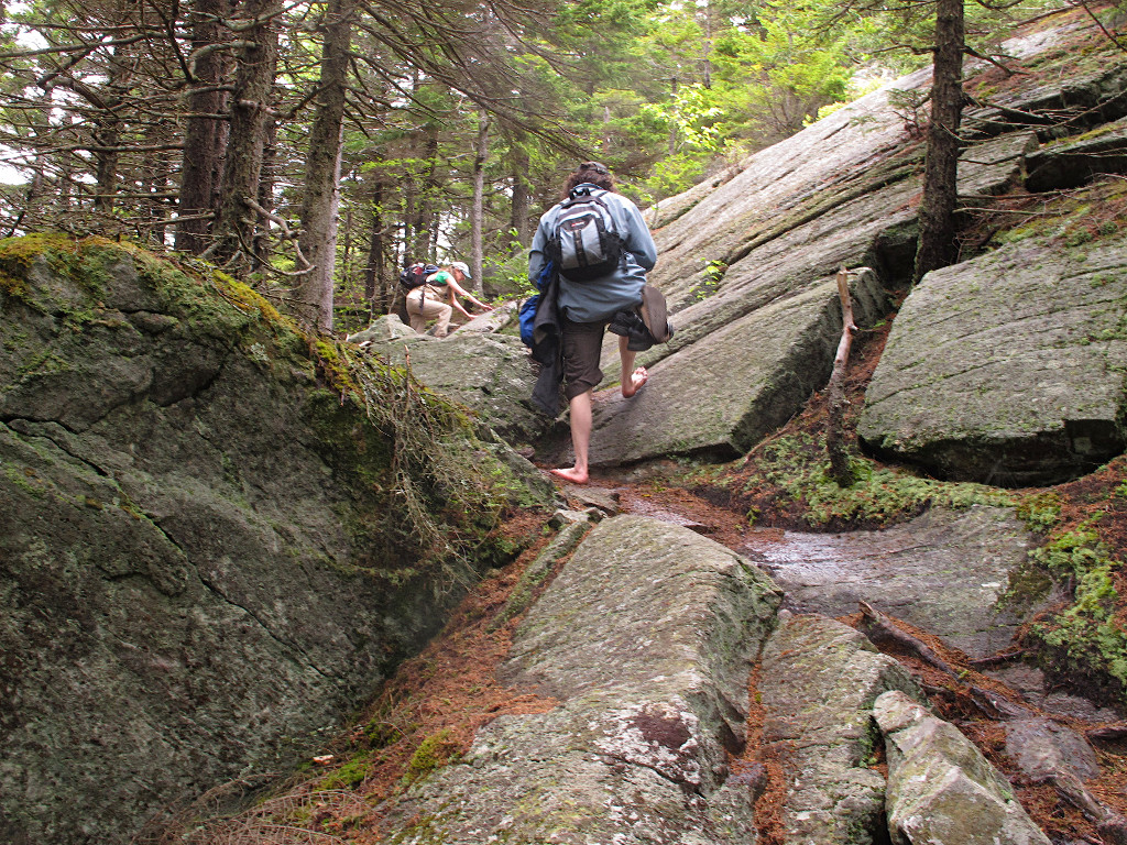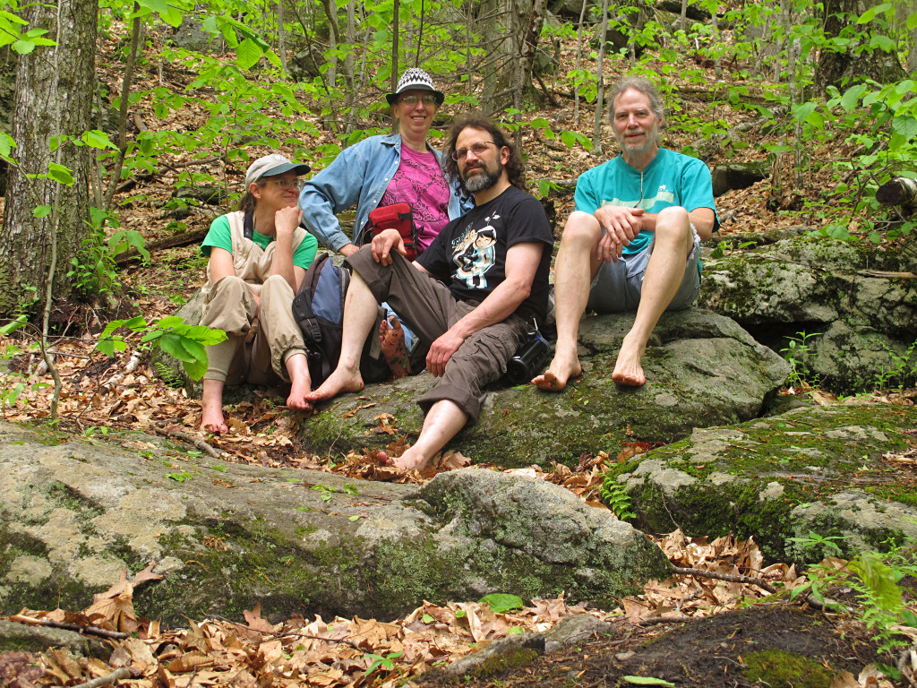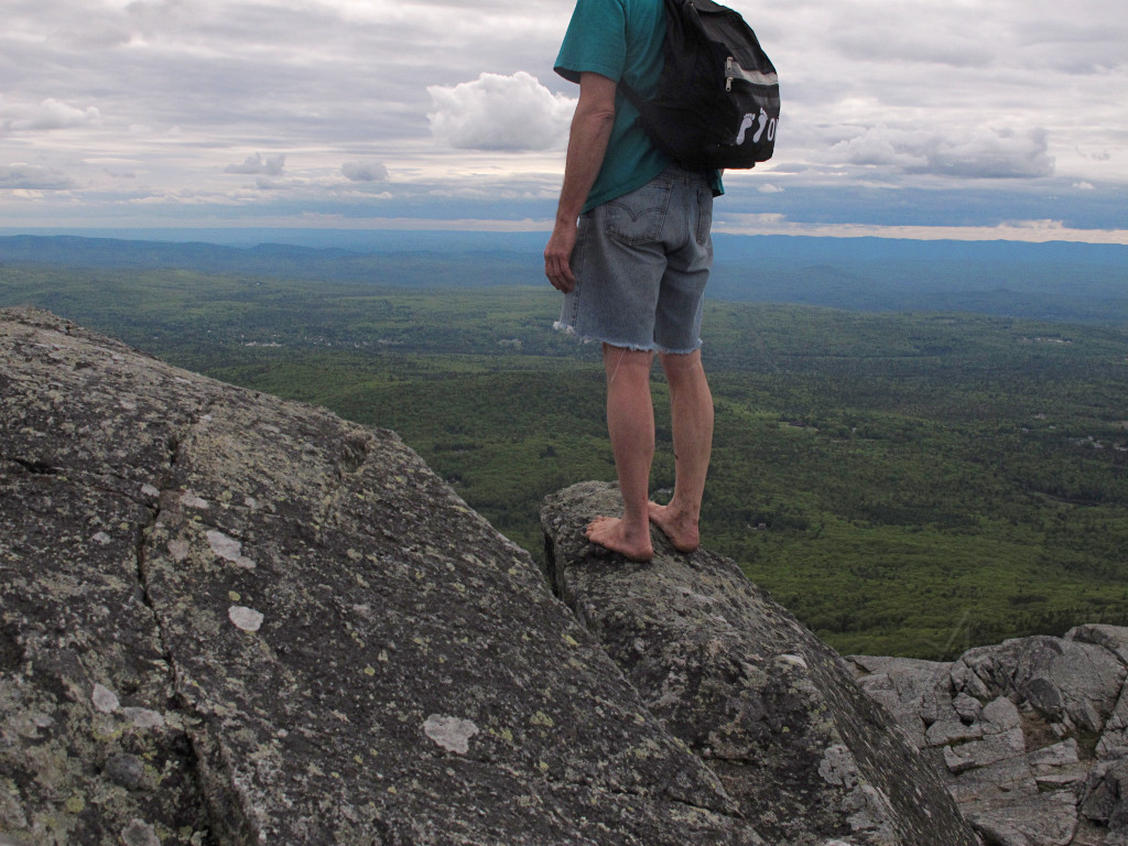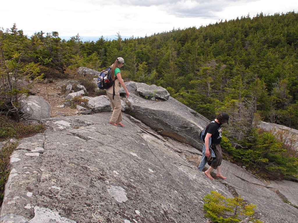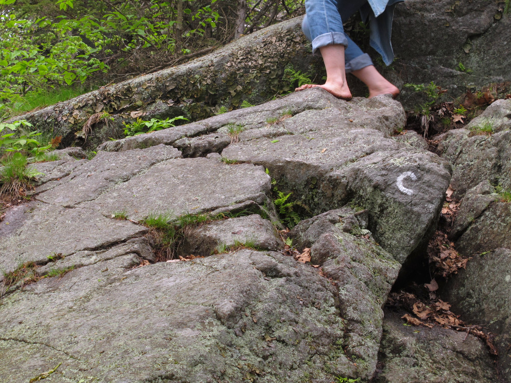 ![]() Barefooting Monadnock is certainly not a new concept; plenty of results come up from a search on "monadnock barefoot" and they all describe it as being pretty awesome fun. One account suggests that some of the park's own rangers even get their share of shoeless miles in. So we did a little planning and google-earthing, and figuring that it was likely to be a pretty crowded weekend up there, I endorsed the idea of a slightly longer but less-traveled route to make a nice loop of maybe 4 and a half miles. That might have been a bit ambitious -- not from anything to do with our feet, but just from hike length and elevation change. As it worked out our group split a couple of times; a subset headed back down via the green dots and another bypassed the summit via the blue ones. But bagging the peak wasn't the sole aim here; the idea was to get out into the woods and just have fun with it. There would be plenty of vertical to keep everyone happy. |