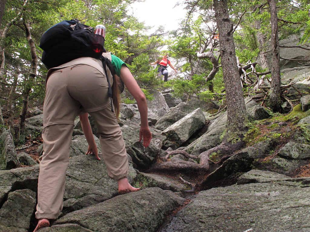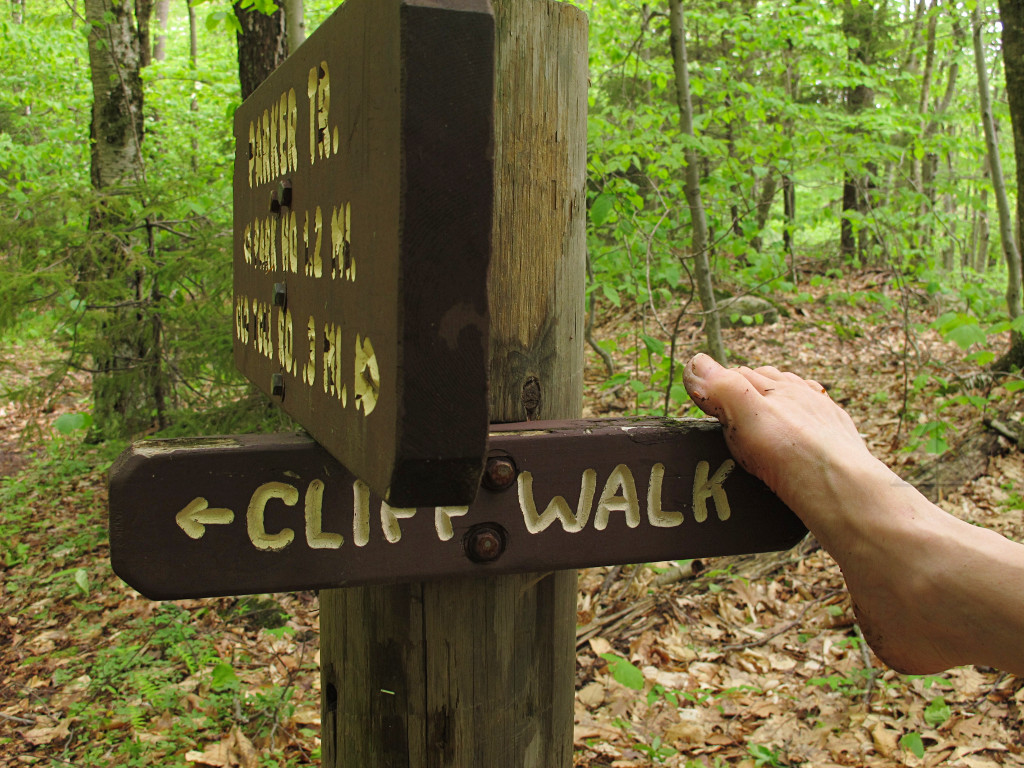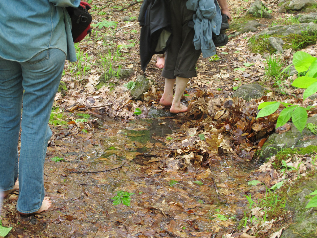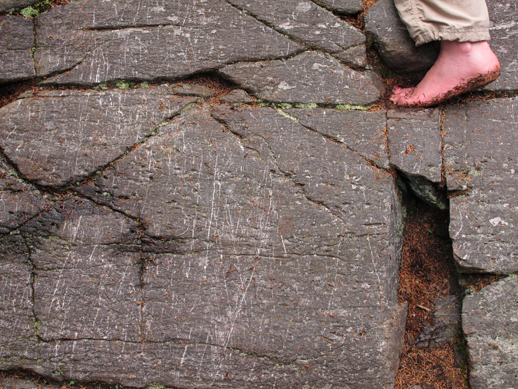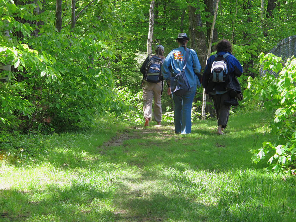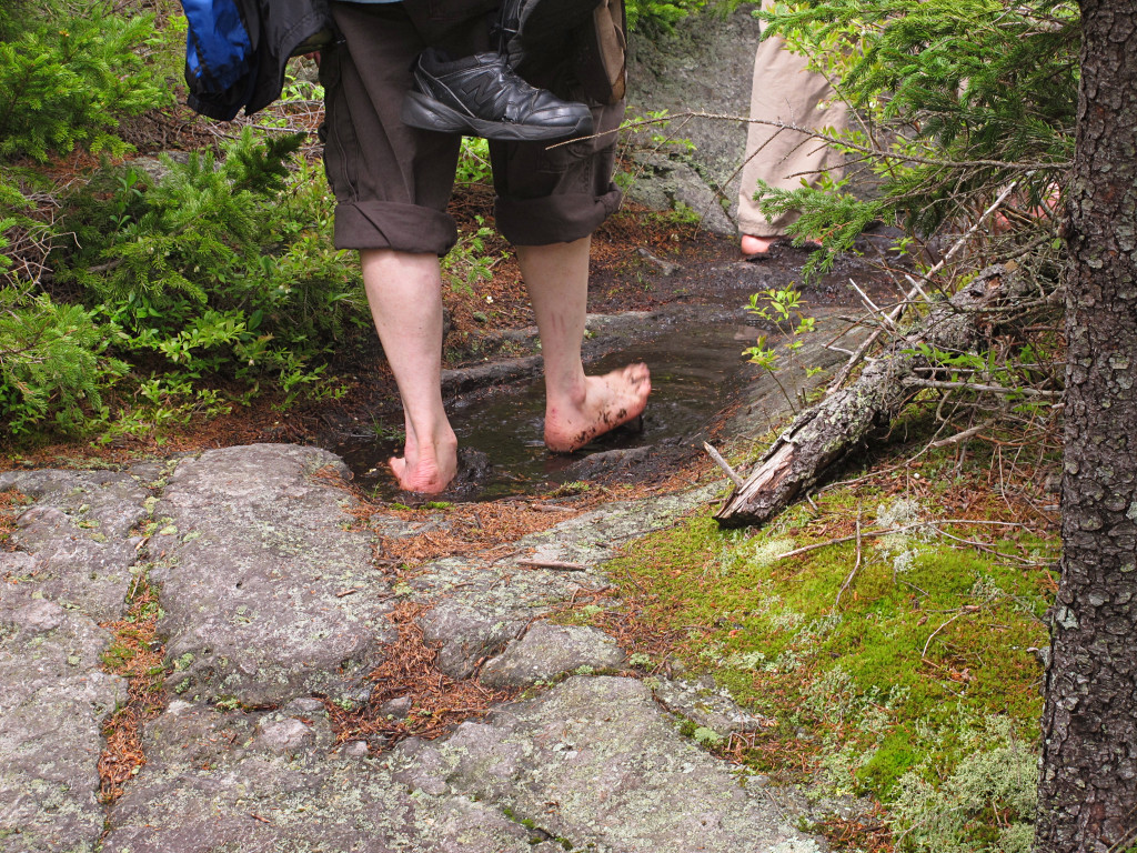 ![]() Barefooting Monadnock is certainly not a new concept; plenty of results come up from a search on "monadnock barefoot" and they all describe it as being pretty awesome fun. One account suggests that some of the park's own rangers even get their share of shoeless miles in. So we did a little planning and google-earthing, and figuring that it was likely to be a pretty crowded weekend up there, I endorsed the idea of a slightly longer but less-traveled route to make a nice loop of maybe 4 and a half miles. That might have been a bit ambitious -- not from anything to do with our feet, but just from hike length and elevation change. As it worked out our group split a couple of times; a subset headed back down via the green dots and another bypassed the summit via the blue ones. But bagging the peak wasn't the sole aim here; the idea was to get out into the woods and just have fun with it. There would be plenty of vertical to keep everyone happy. |