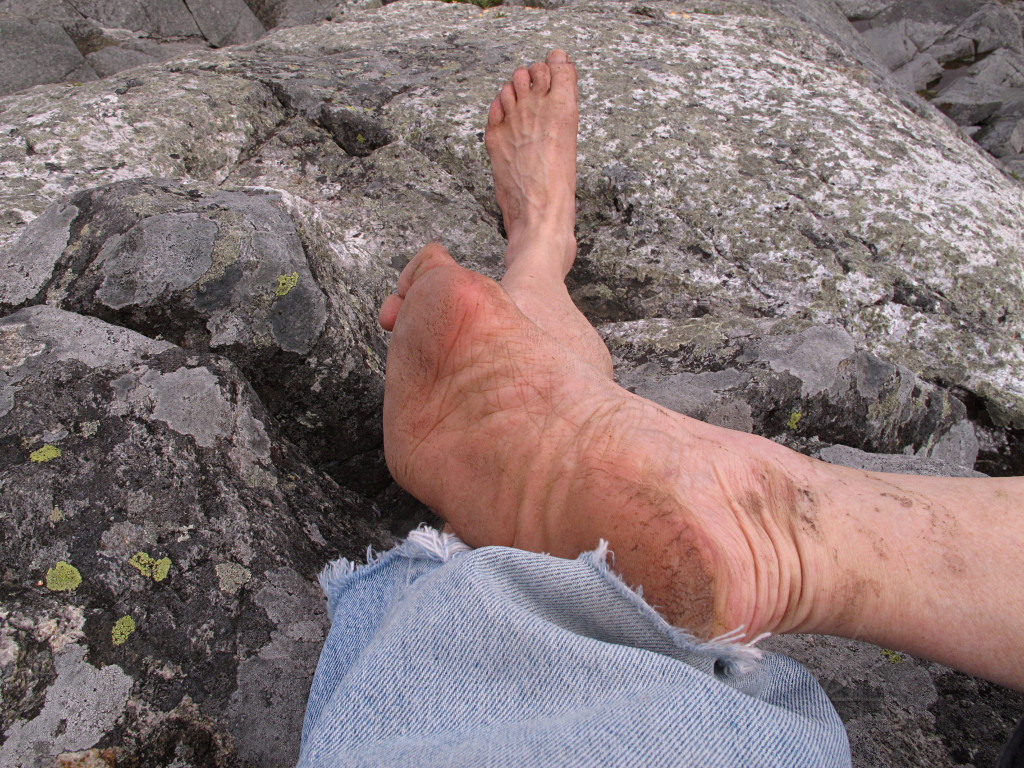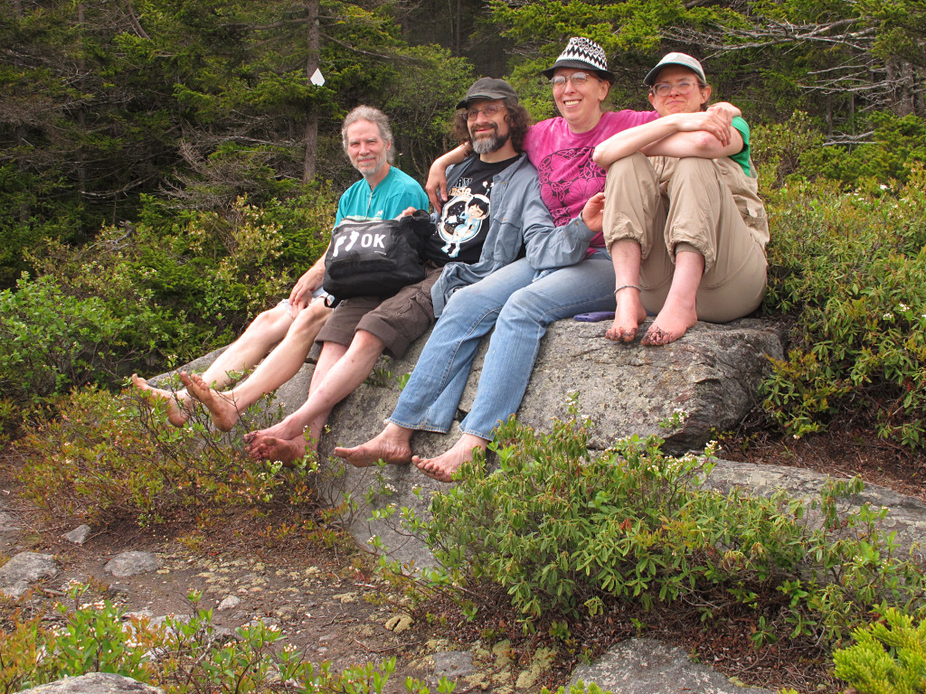 A little searching later found the relevant incident. The search results showed quite a few others at different times, too. This was apparently one of the easier ones to handle, not too far up the trail -- by the time we got back to the car and got ourselves organized and loaded to head out, the ambulance had already pulled up and they had the victim off the mountain. One ranger told us that some of those rescues, farther up, take six or seven hours far into the night, but it's one reason they're there. And of course the higher likelihood of mishap comes later in the day, when people are tired and stupid and trying to come *down* which is usually trickier than heading up. Something to always keep in mind on such trips. Monadnock itself is a bit deceptive -- people discover that it's more difficult than they counted on, sometimes with disastrous results. The four-and-some miles I had plotted became a bigger deal with all the vertical, but in our varying preferred degrees we got out and did it, never resorting to footgear at all, and overall it was a pretty awesome day -- completely in line with all those other searchable reports. We stopped at a pub in Jaffrey for a brief dinner, and then it wasn't too far back to home and a very welcome bed. [And exactly a year later, did the climb again!] |