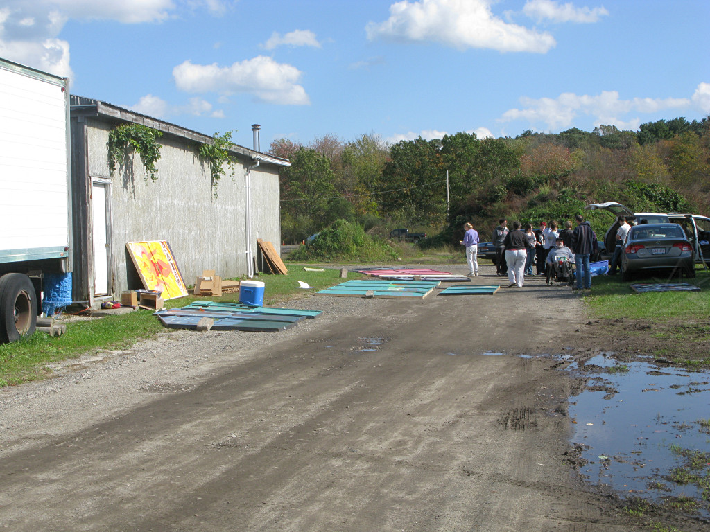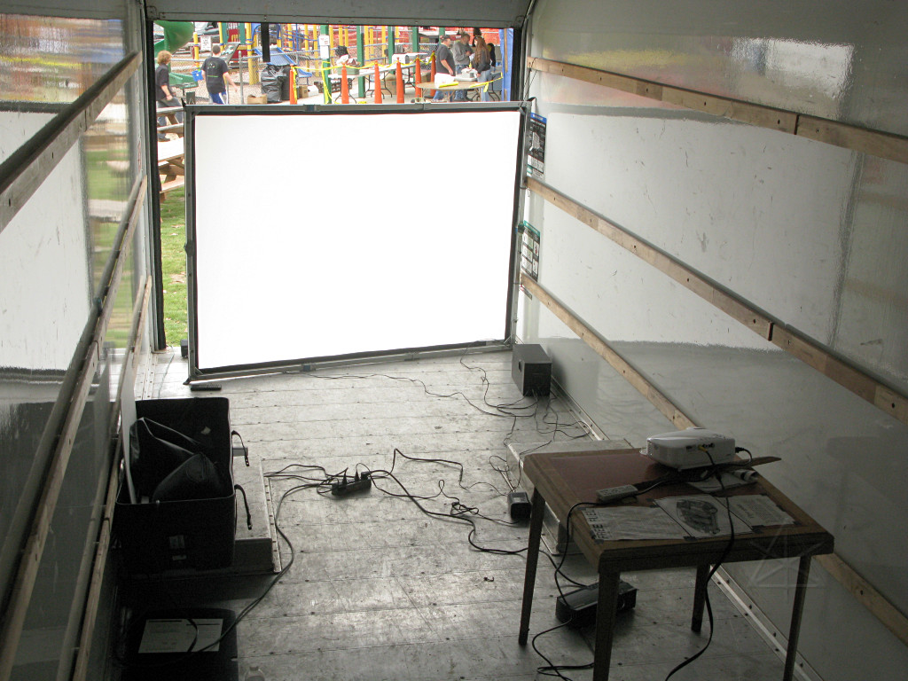 Because of another new thing for this year: movies! The truck got set up as a projection booth to run cartoons, shorts, and trailers and entertain the people sitting around at the picnic tables. I borrowed a real professional-grade "fastfold" rear-projection screen from NESFA that gets used at various area conventions; it turns out that a 5 x 7 foot unit fits very nicely into the back of a standard box truck. I simply lashed one side of the frame to the load rail and let it sit on the floor, giving a good viewing height from outside. |