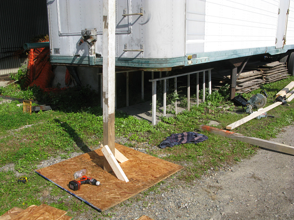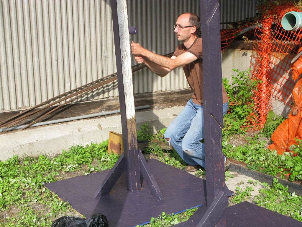 I used the time to get most of the redneck area lights into the air, which after the lessons from last year received a lot more reinforcement against wind this time. I figured that despite wiggly PVC pipe and flimsy clips and reflectors, with enough tie-line lashed around their parts the big CFL fixtures weren't going anywhere. |