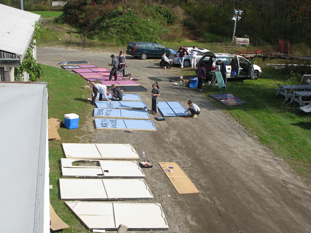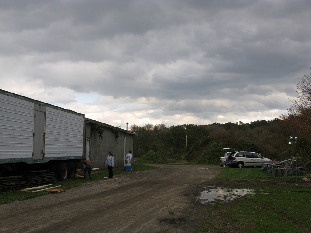 Unfortunately I didn't get a good front-on picture of the backdrop but I'm hoping someone else did. The scene was nicely *hand-painted* onto a big bedsheet, from Mike's conceptualized sketch of Clarke Park itself based on a couple of pictures I took for him. A really nice job , and my attempts to extract it from mostly unrelated shots don't do it justice. It's on a sheet because the original idea was to have it up in front of the second-scene set as sort of a kabuki drop, and then change it quickly in black. Since that would have been more of a cueing headache and the tent was large enough to hold both scene elements with separate lighting, it was simpler just for people to move over so the sheet wound up simply hanging in place the whole time. |