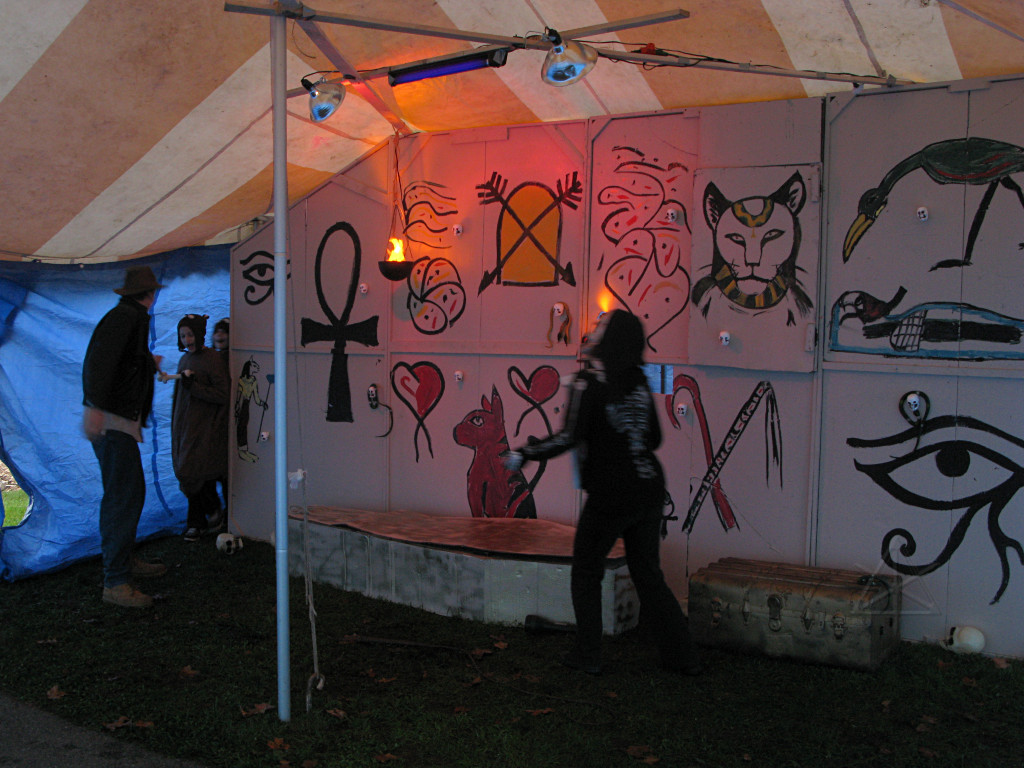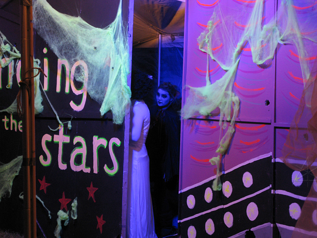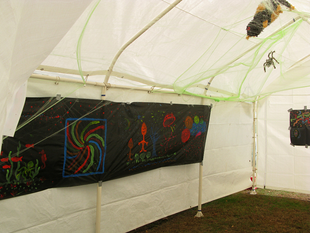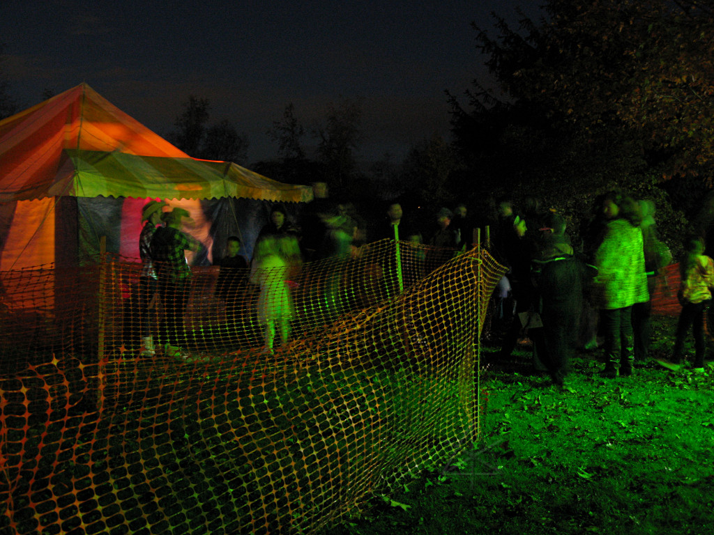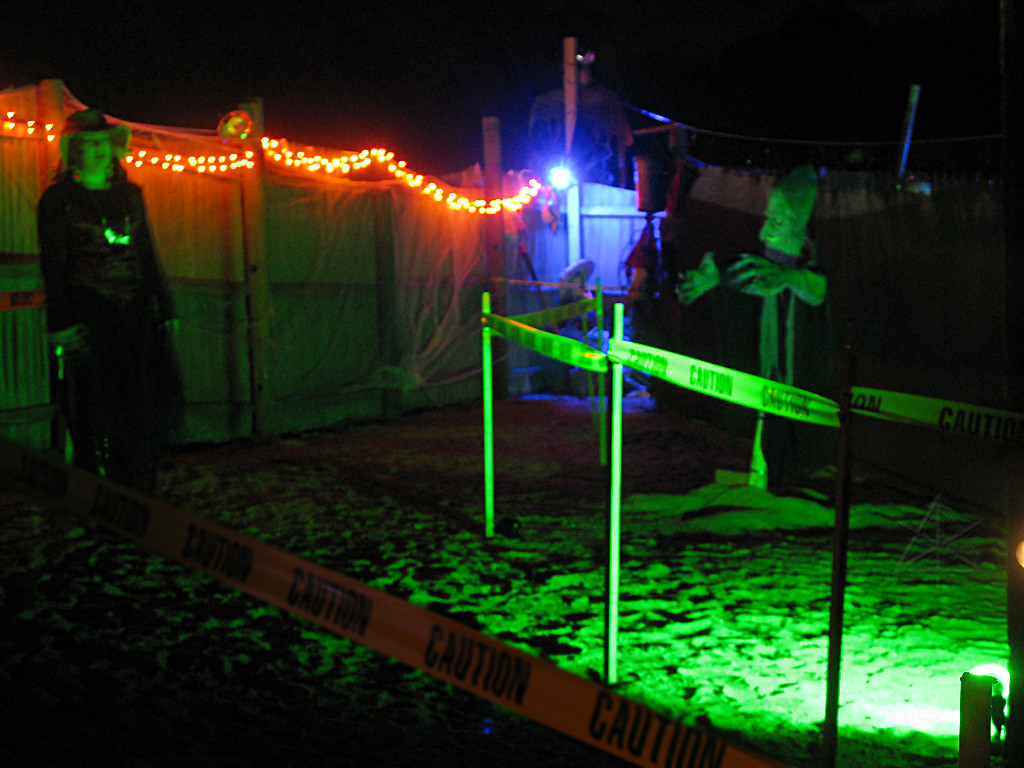 The third new thing this year involved an extra party-tent being set up, into which were installed painted panels designed to work well with the ChromaDepth glasses from American Paper Optics. With blacklight and strobes added, along with fluorescent paint and spiderwebby stuff, sixties flashbacks would be the expected norm here but this time, in free-floating 3-D!. This turned out to be rather popular; there was a line waiting to get in for much of the evening. |