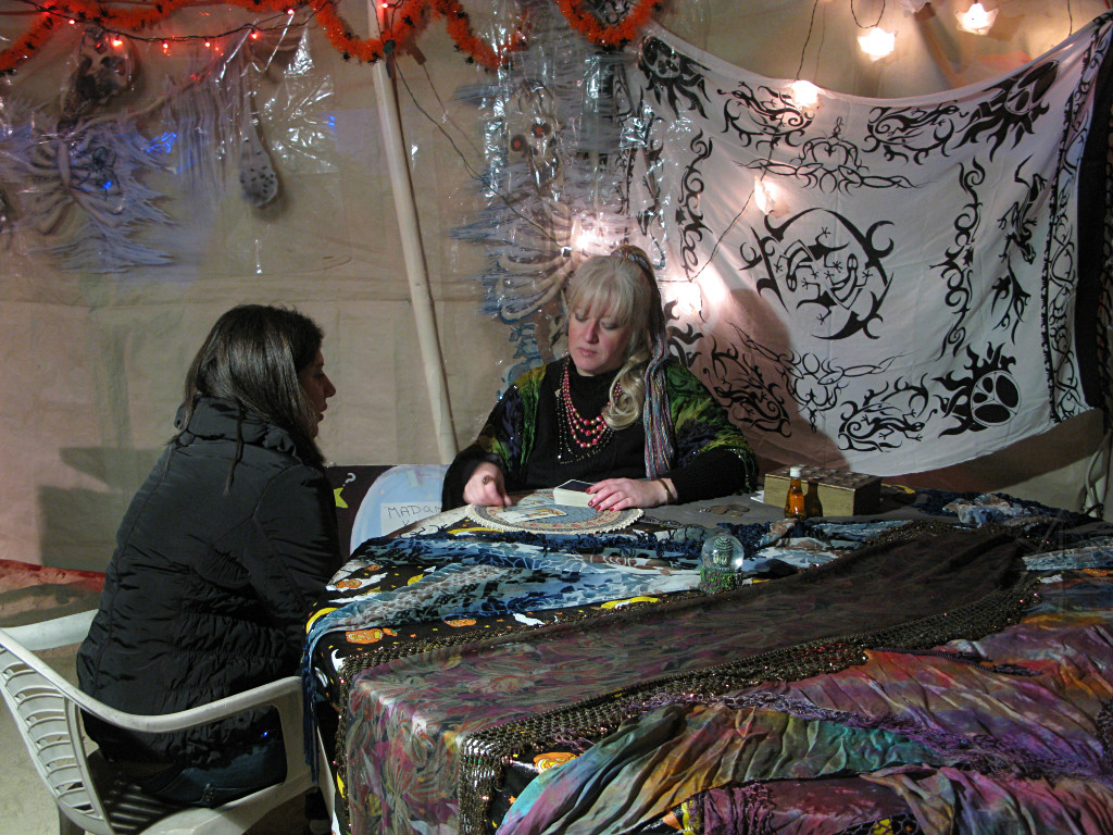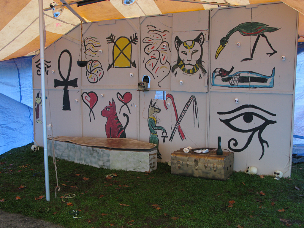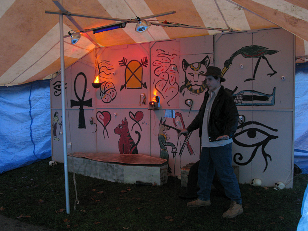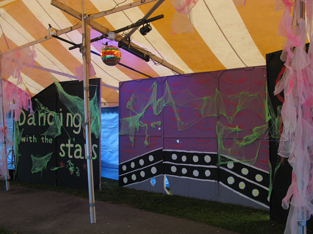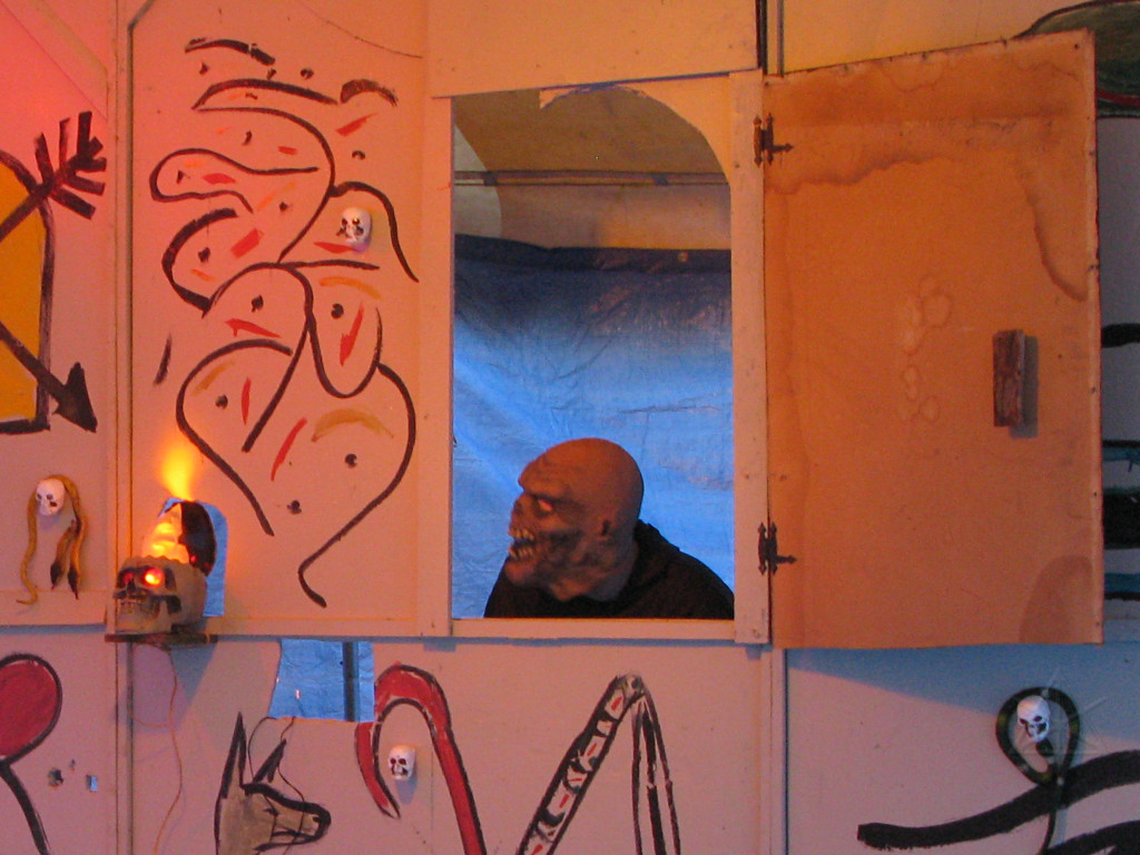 The third new thing this year involved an extra party-tent being set up, into which were installed painted panels designed to work well with the ChromaDepth glasses from American Paper Optics. With blacklight and strobes added, along with fluorescent paint and spiderwebby stuff, sixties flashbacks would be the expected norm here but this time, in free-floating 3-D!. This turned out to be rather popular; there was a line waiting to get in for much of the evening. |