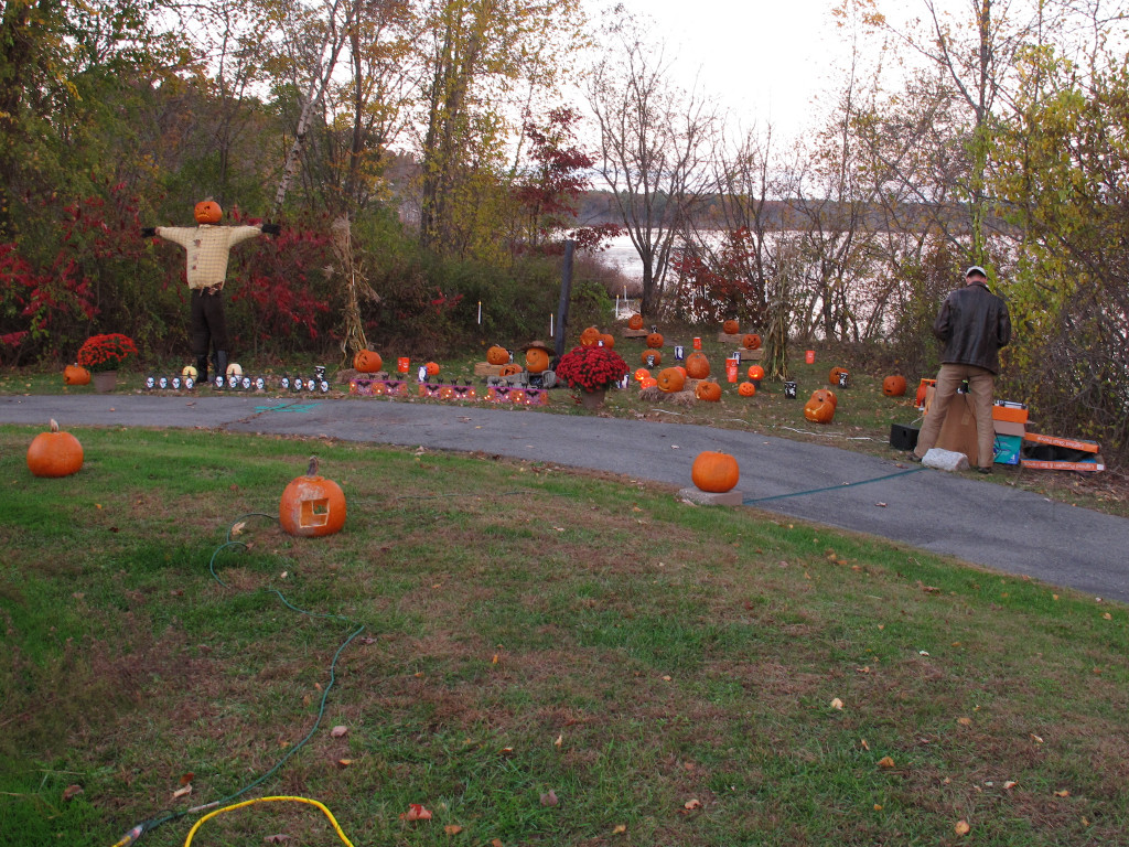 Pumpkin patch being constructed. Peter had a brilliant inspiration with the "floating" candles suspended on string; they added real eerie depth to the whole picture when viewed at night. |