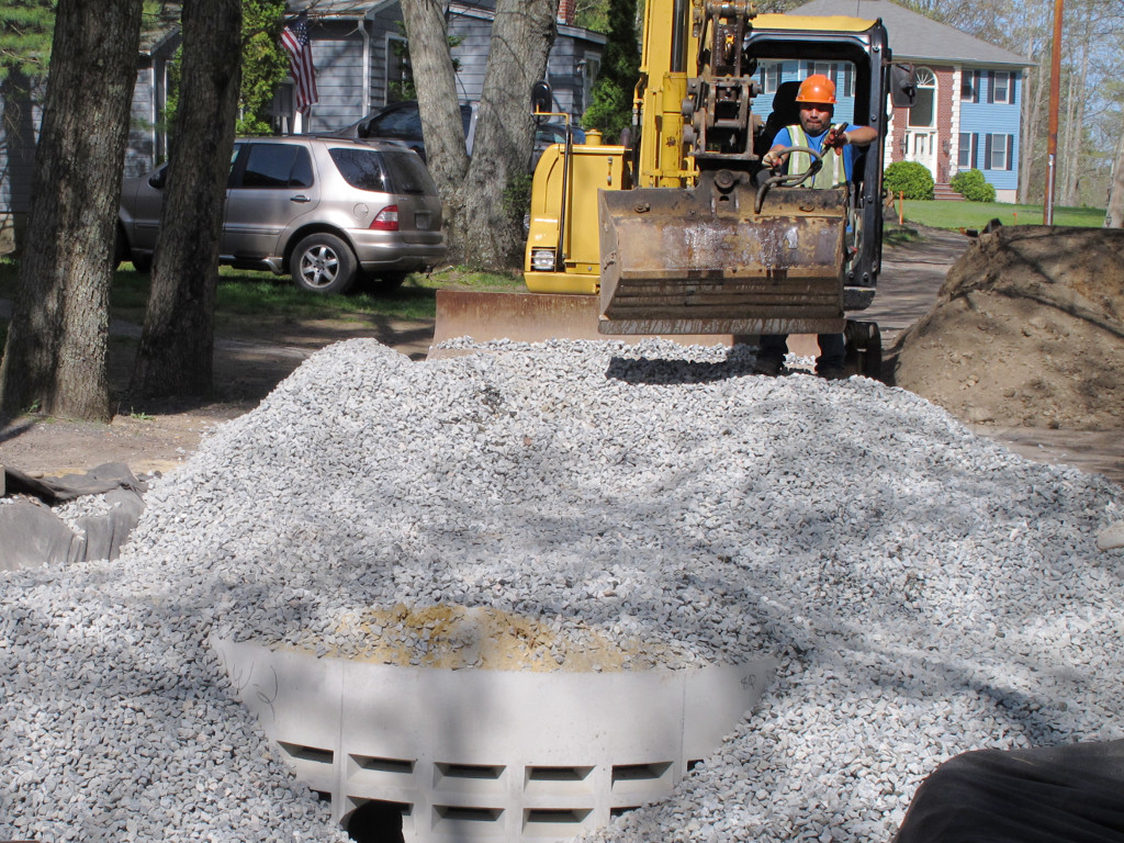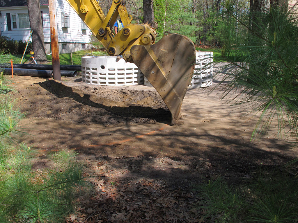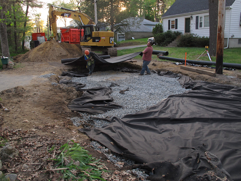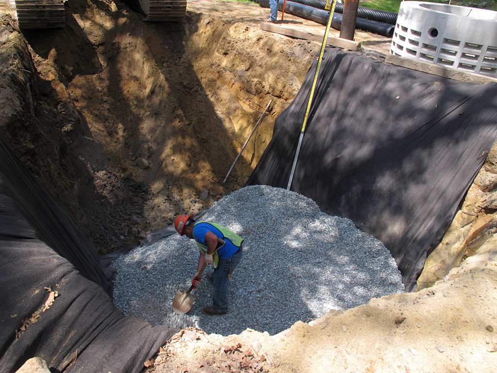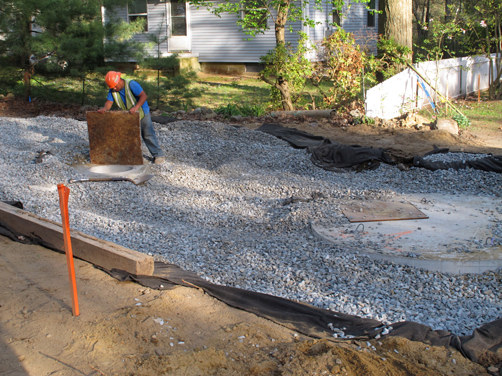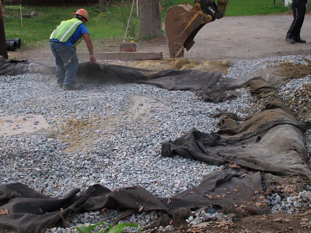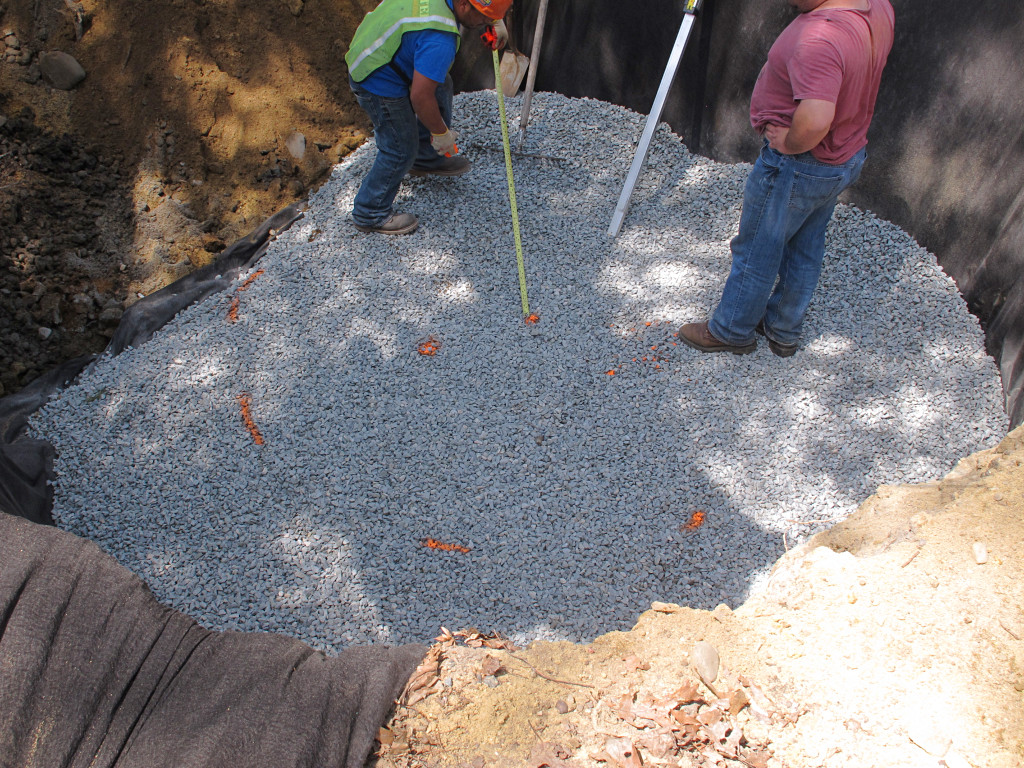 With all the pipes laid in, the thing looked just like the design! Funny that. Except that there was probably a lot more drainage stone involved in this than anyone had predicted. |