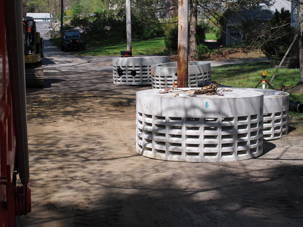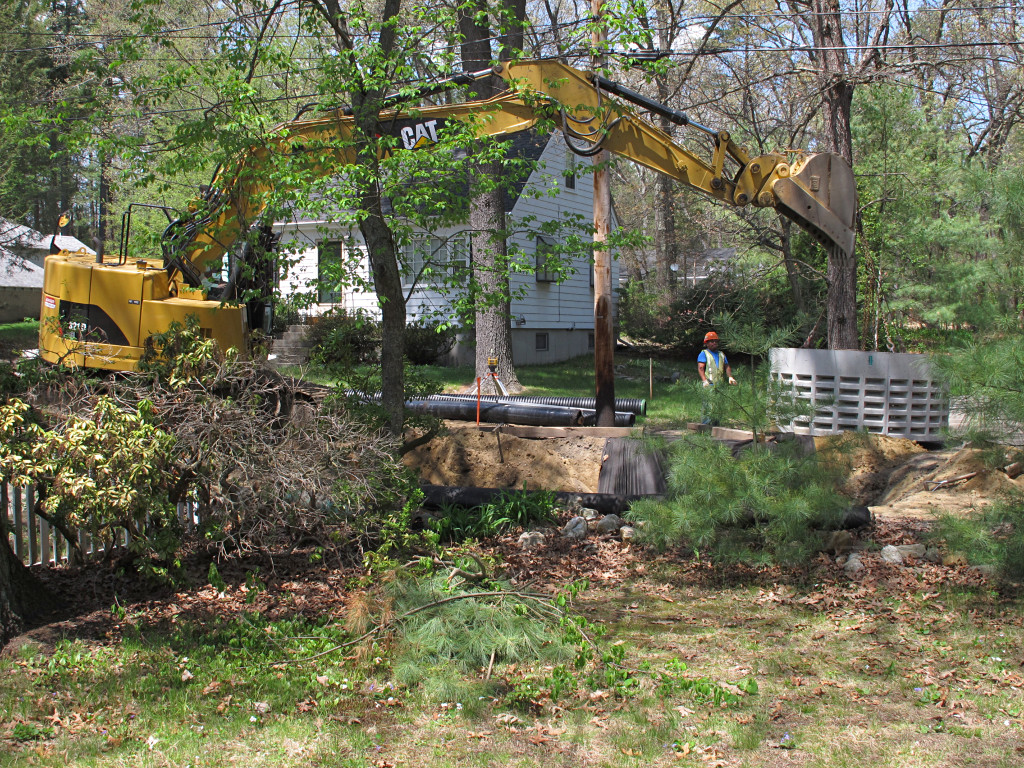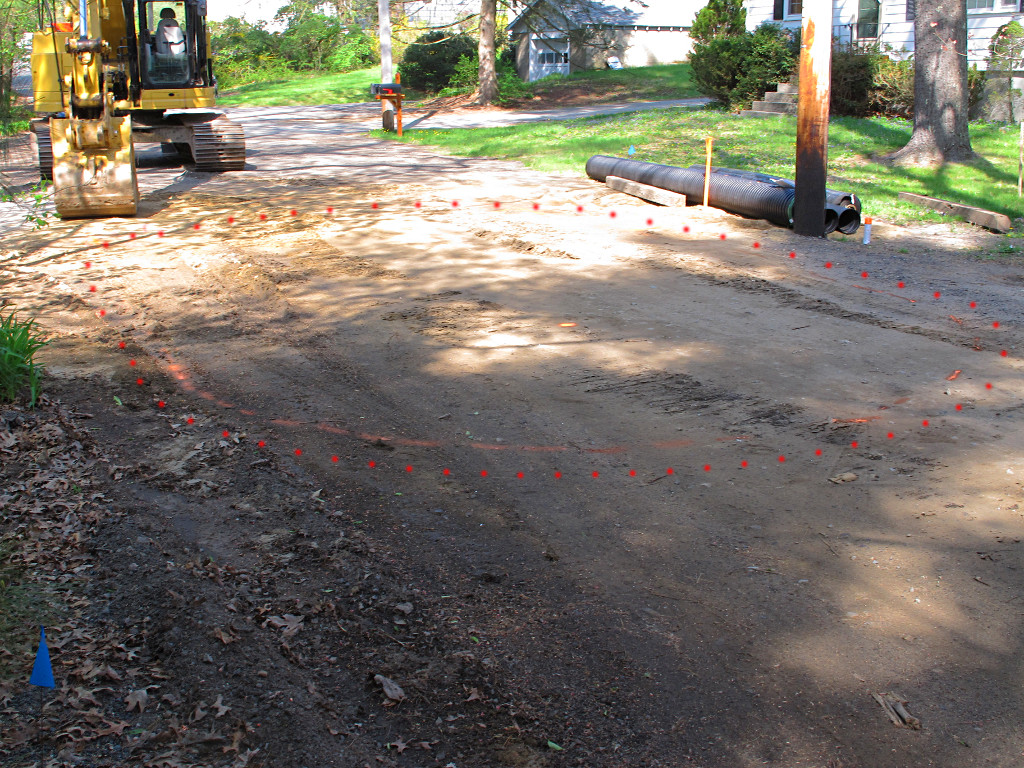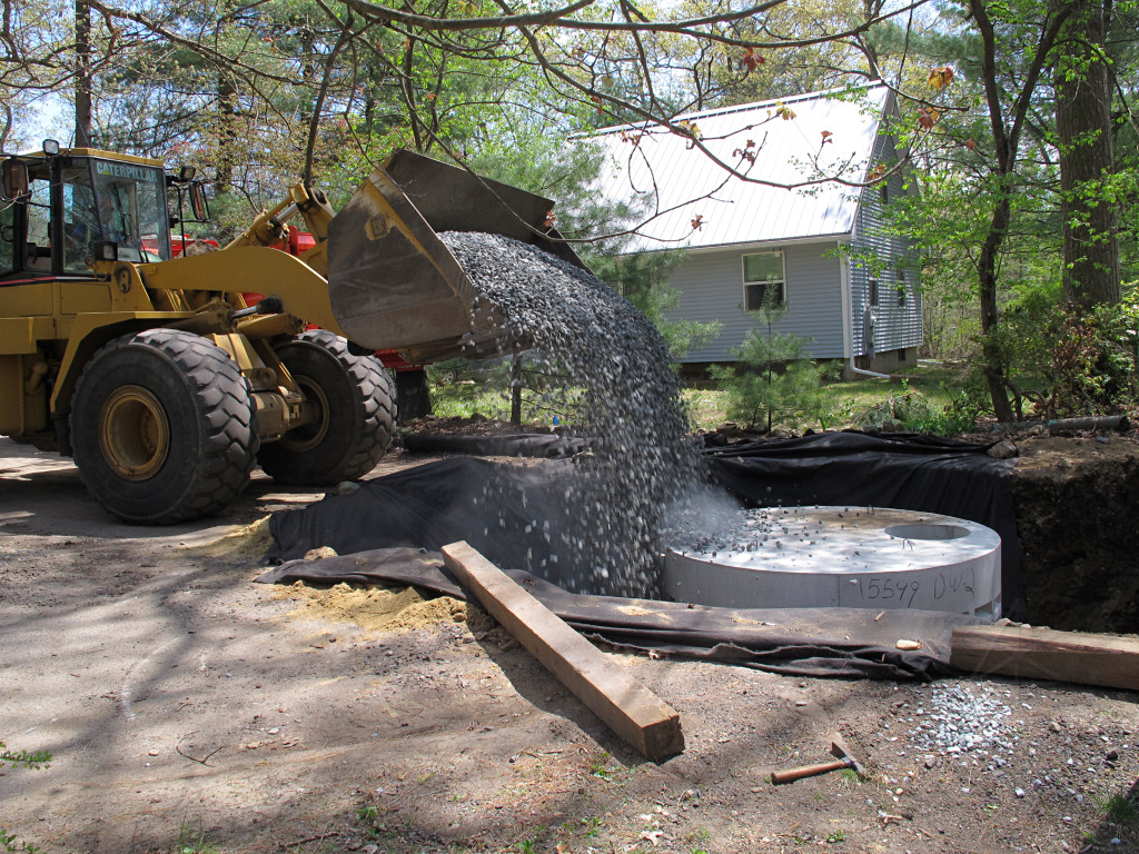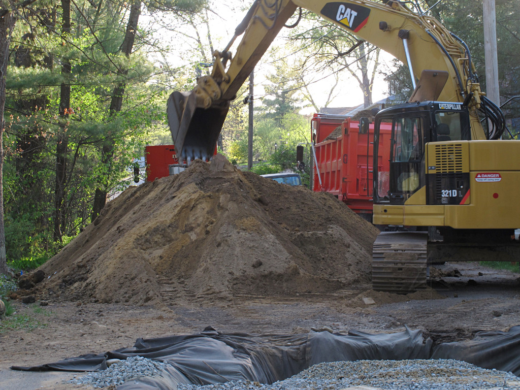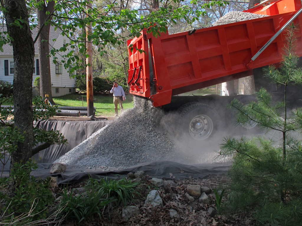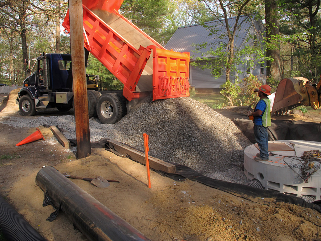 With all the pipes laid in, the thing looked just like the design! Funny that. Except that there was probably a lot more drainage stone involved in this than anyone had predicted. |