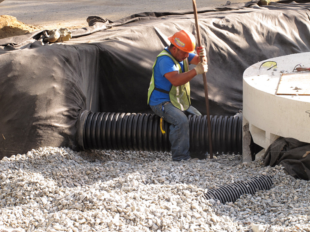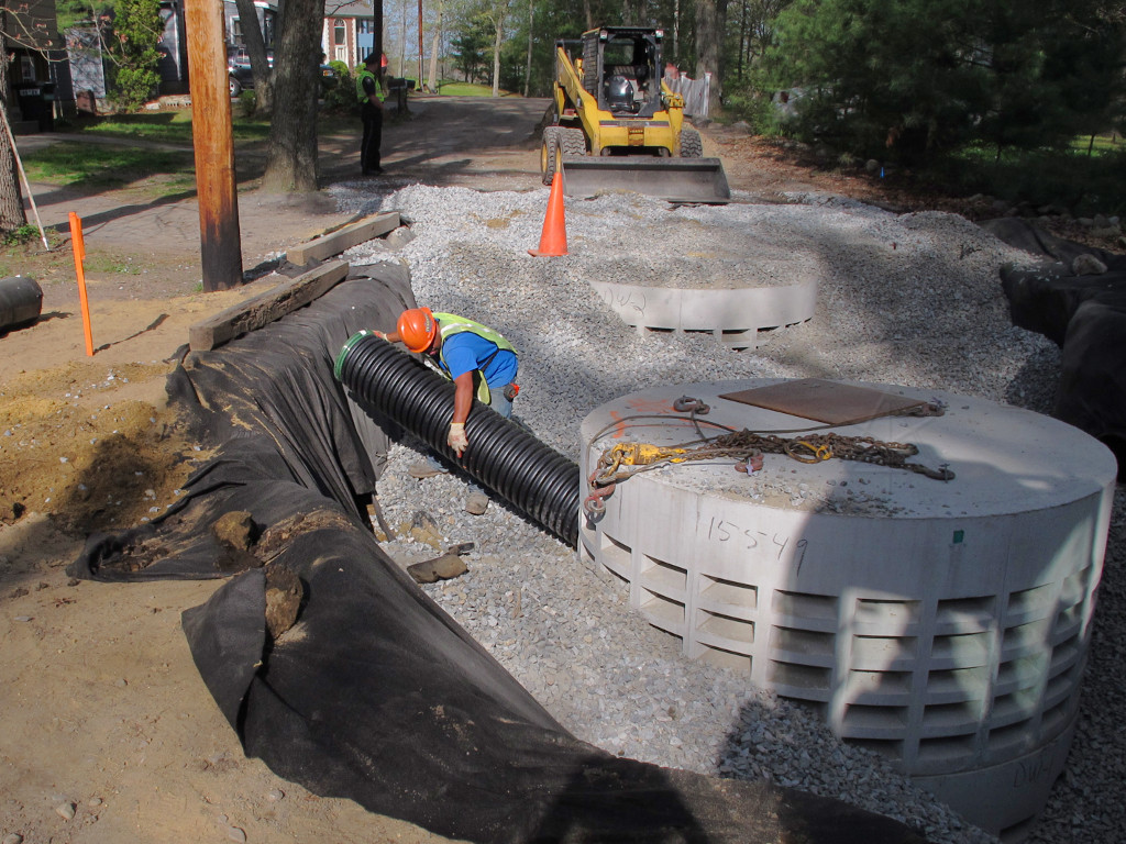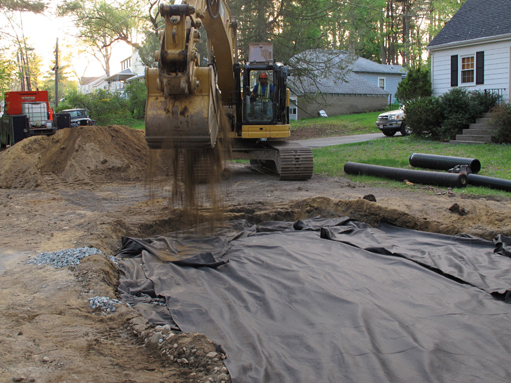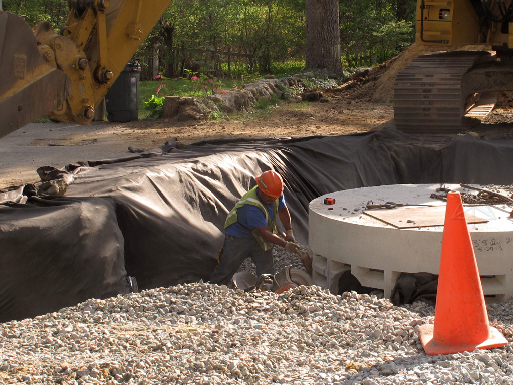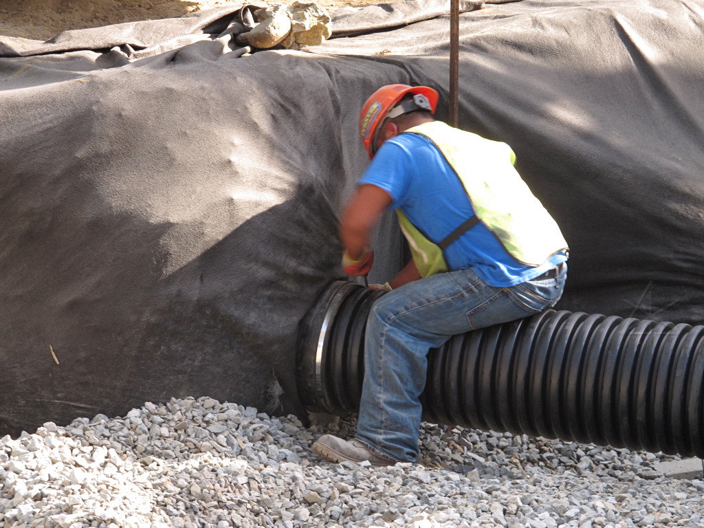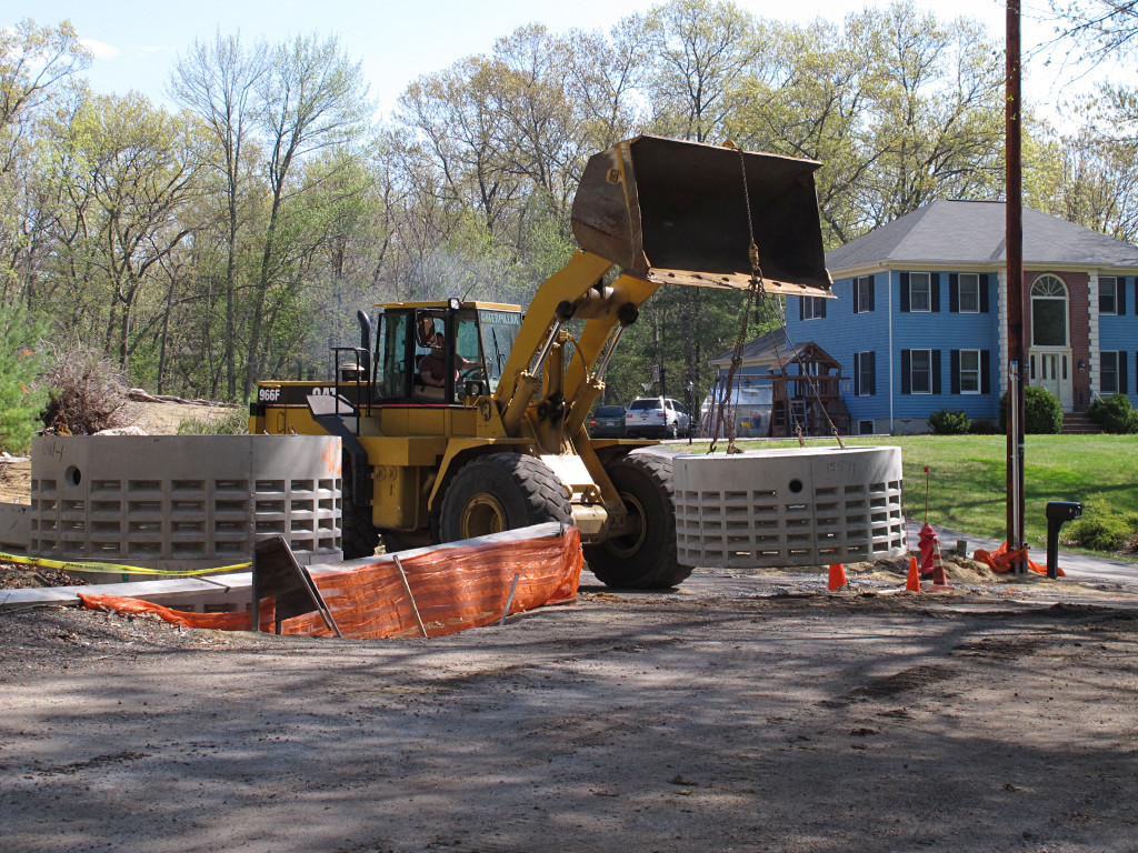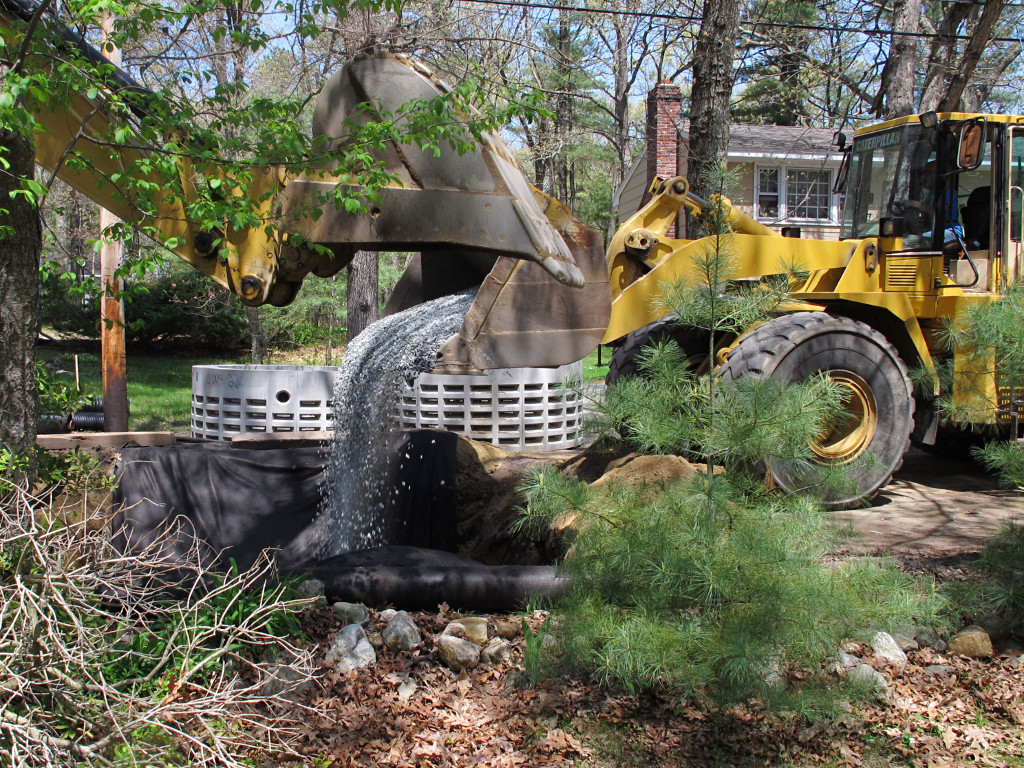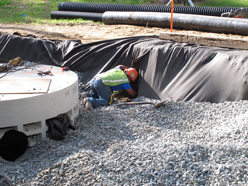 With all the pipes laid in, the thing looked just like the design! Funny that. Except that there was probably a lot more drainage stone involved in this than anyone had predicted. |