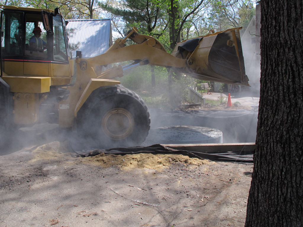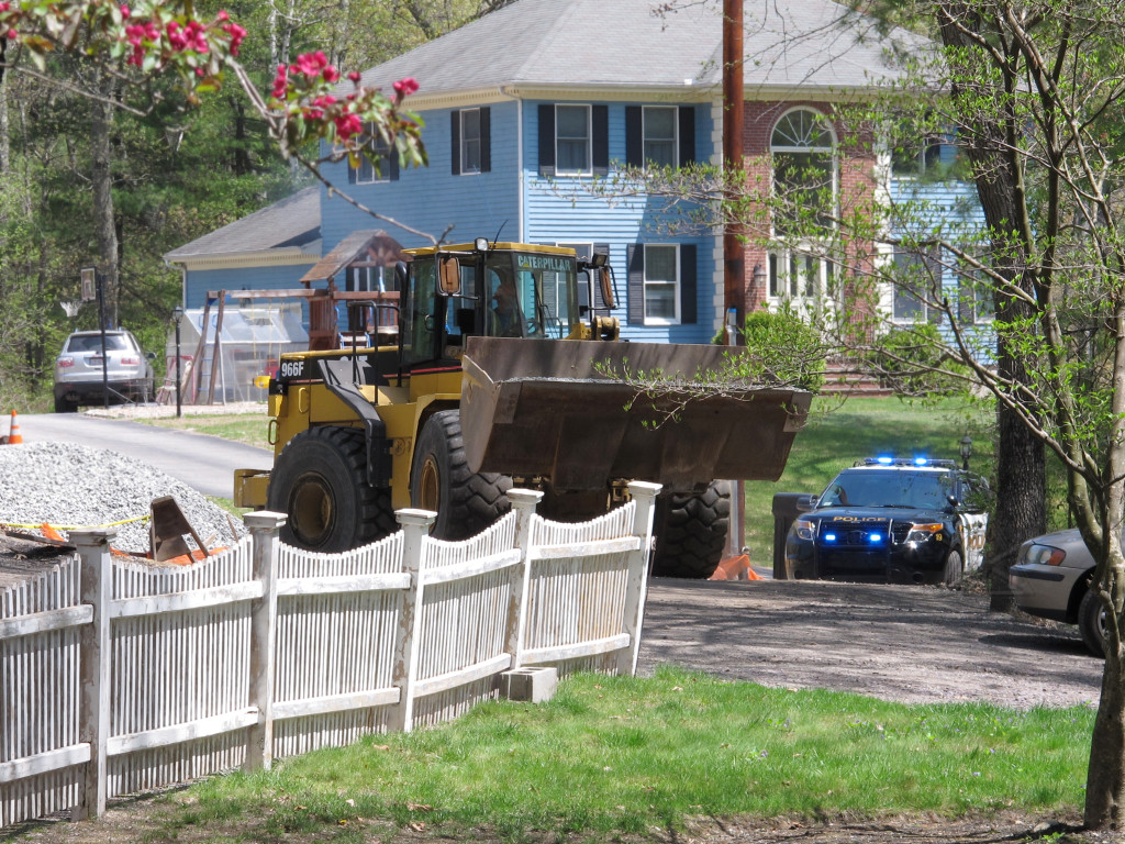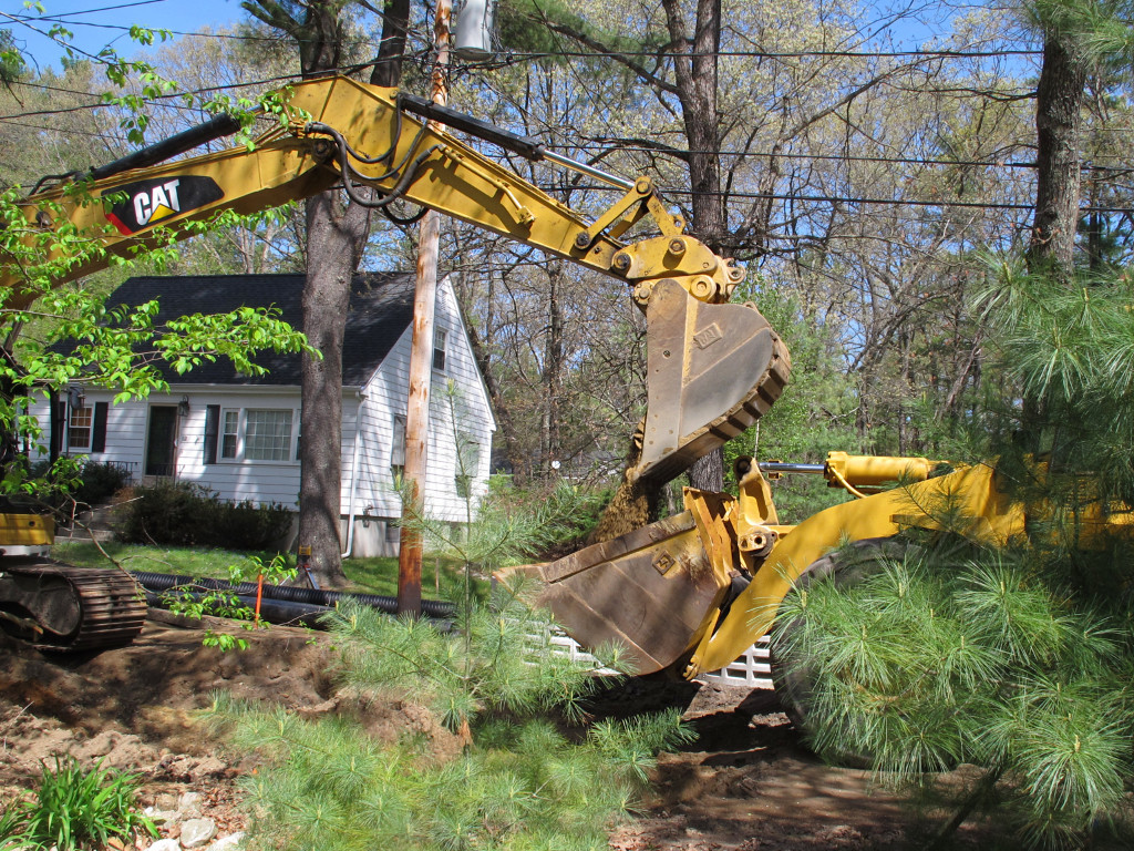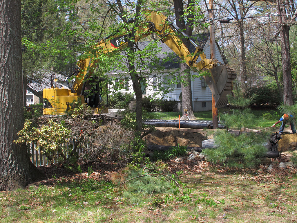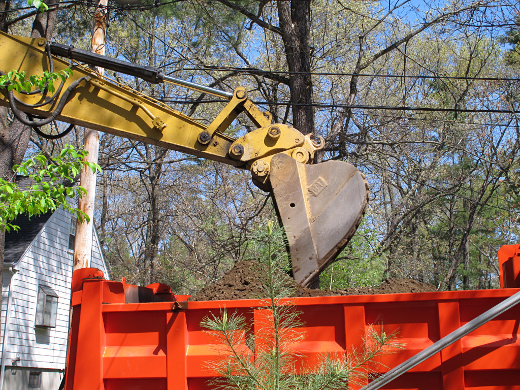 He had his challenges cut out for him that morning, with my FiOS fiber right in the way again [the tiny one that looks parallel to the tree]. My power feed above that and all the neighbor's service drops were also part of his headaches that morning. The expected dirt volume would be much larger than for the catch basins and would mostly be replaced with stone, so he wanted to truck most of it away. But to drop dirt into the dumper, he had to swing the bucket in sideways with about a foot to spare between the truck and the fiber, and then dump the bucket very carefully without pulling the boom and stick up too far. |