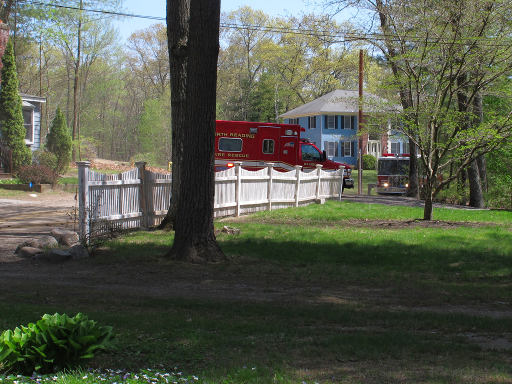 FiOS drops don't always get flown from the pole; this one hops off mid-cable and just attaches to the main messenger for the trunk, which even though thus slightly deflected nonetheless provides enough tension against the house attachment to hold everything up. Part of that is because the fiber drop cables come in a variety of fixed lengths with preassembled connectors, so some adaptation has to be made to reach end-to-end and not have too much excess coiled up somewhere, and they don't weigh much so it isn't a lot of sideways pull on the trunk. The fact that such a rig had a lot more overall "springiness" to it probably helped save the drop; if it had been held between two hard points it might well have snapped. |