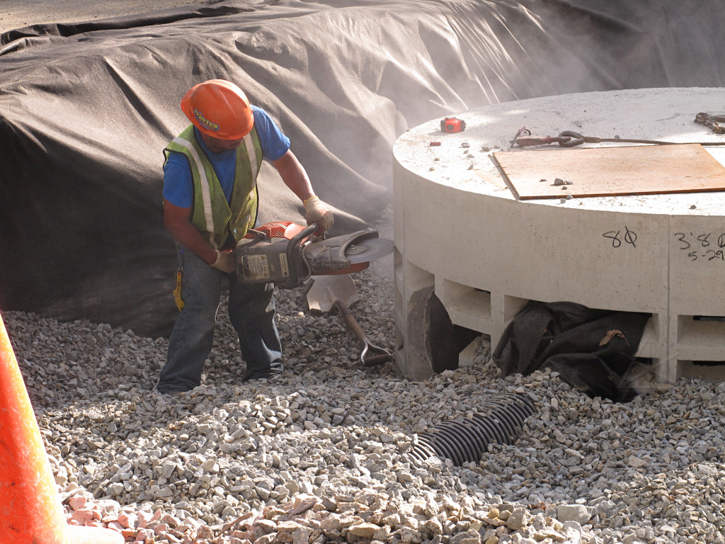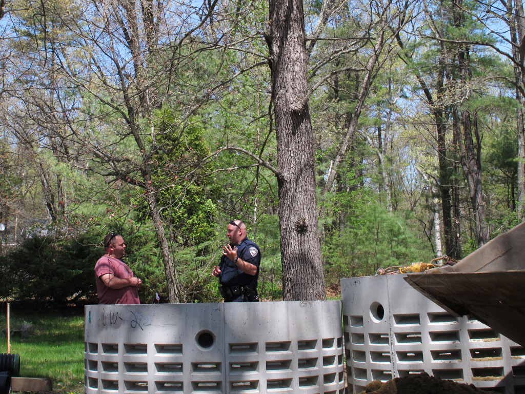 A guy from the hired engineering company showed up to inspect some things, and wanted the crew fellow to break off from his stone-pushing to check some heights. There was apparently concern that the top of the structure was a little too high, not allowing sufficient depth of roadbed above. But the last thing anybody wanted to do was pull those structures up again and try to muck around underneath. |
