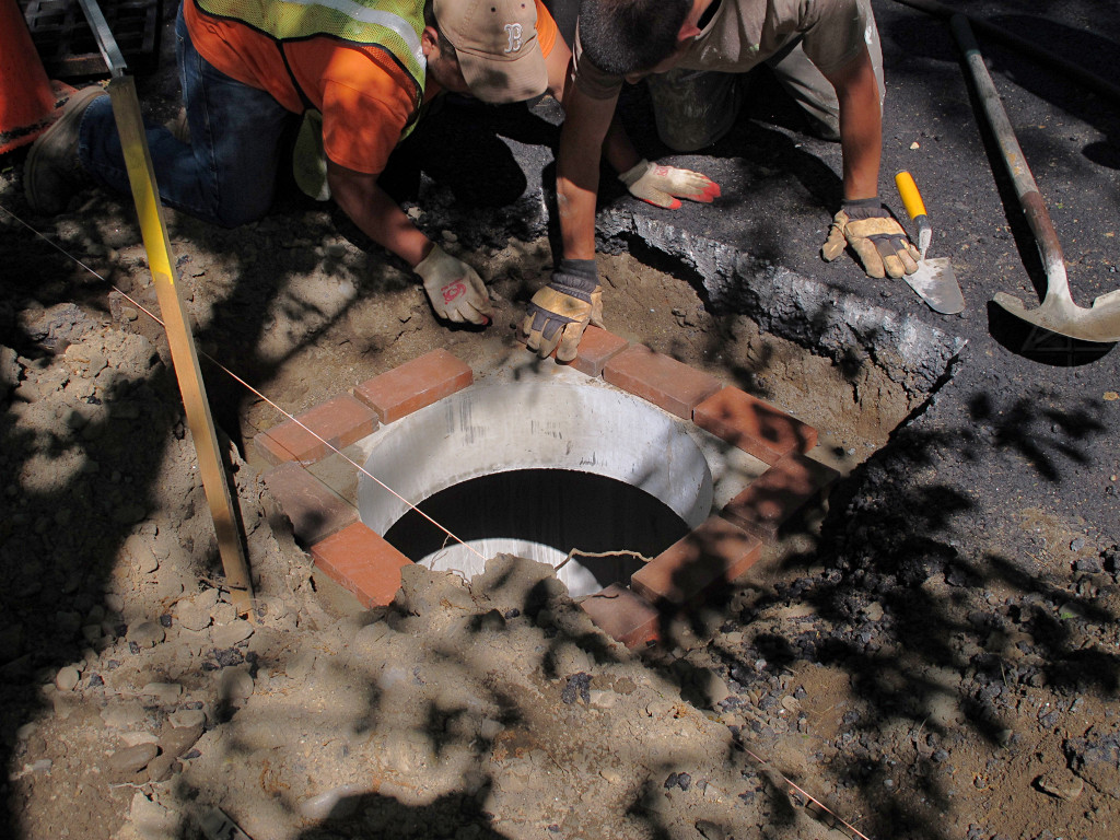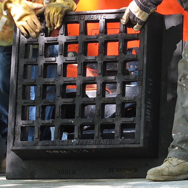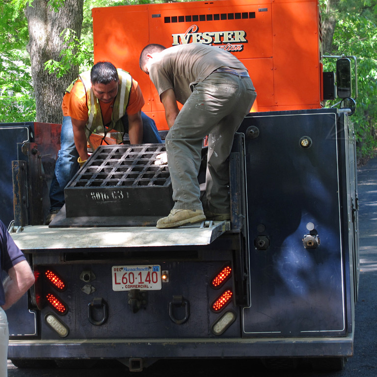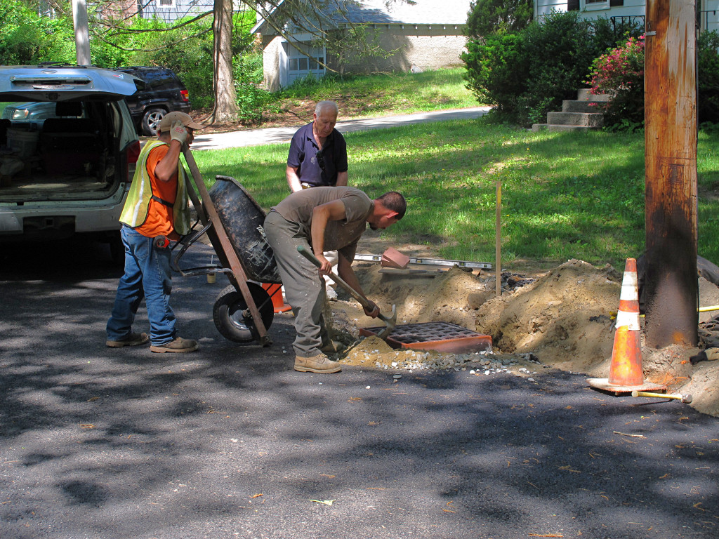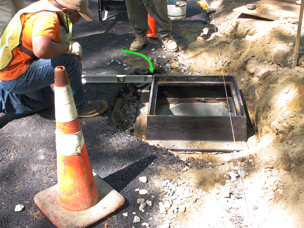 The guy living across the street from me wasn't so fortunate in this regard; when the water crew was out marking shutoffs they had *never* found his even after throwing every piece of fancy locator gear they had at it. Hopefully he's good for the next twenty years... The road crew had been finishing up the catch-basin inlet grilles in the meantime, finishing the backfilling and grouting and a little sweeping up afterward. The next task was installing similar frames over the two big infiltration structures, but with solid manhole covers over them instead of gratings. The whole idea is that drainage water and everything it carries goes into the side catch basins to settle out, and only *water* goes into the infiltration but there still might be some need to get into the latter for cleaning sometime so a means of access was part of the requirements. |