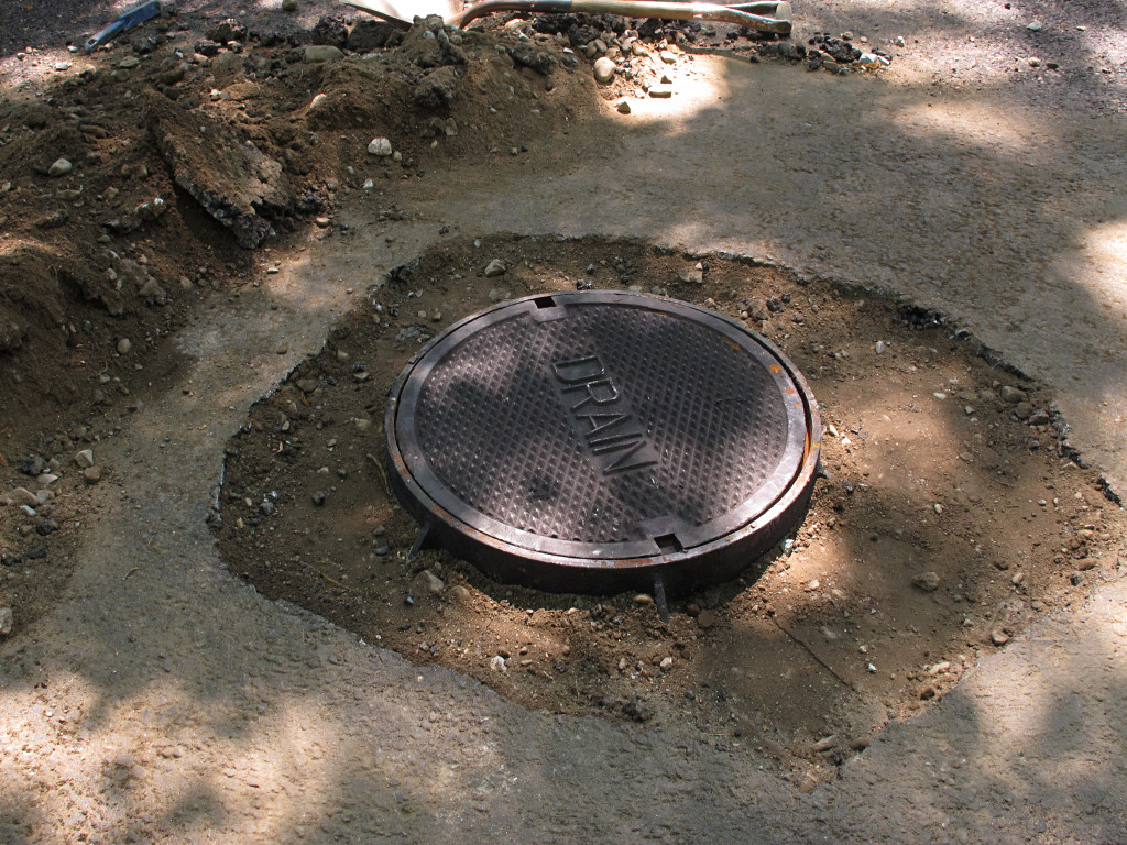 One can envision the next steps on both manholes -- same as the catch-basin grates, some grout on top to lock it down and then dirt fill, with another inch or two of concrete to finish off. |