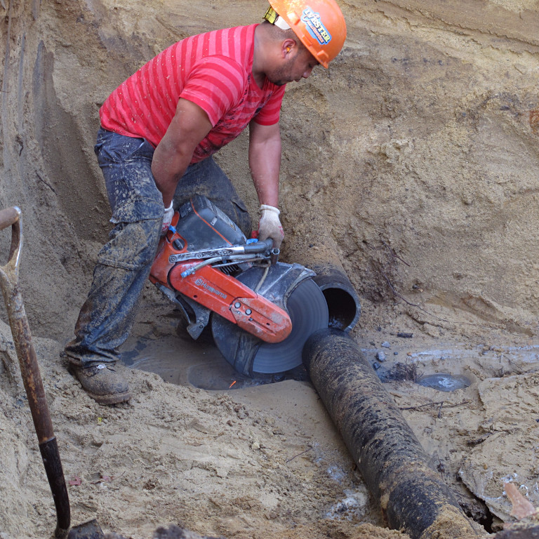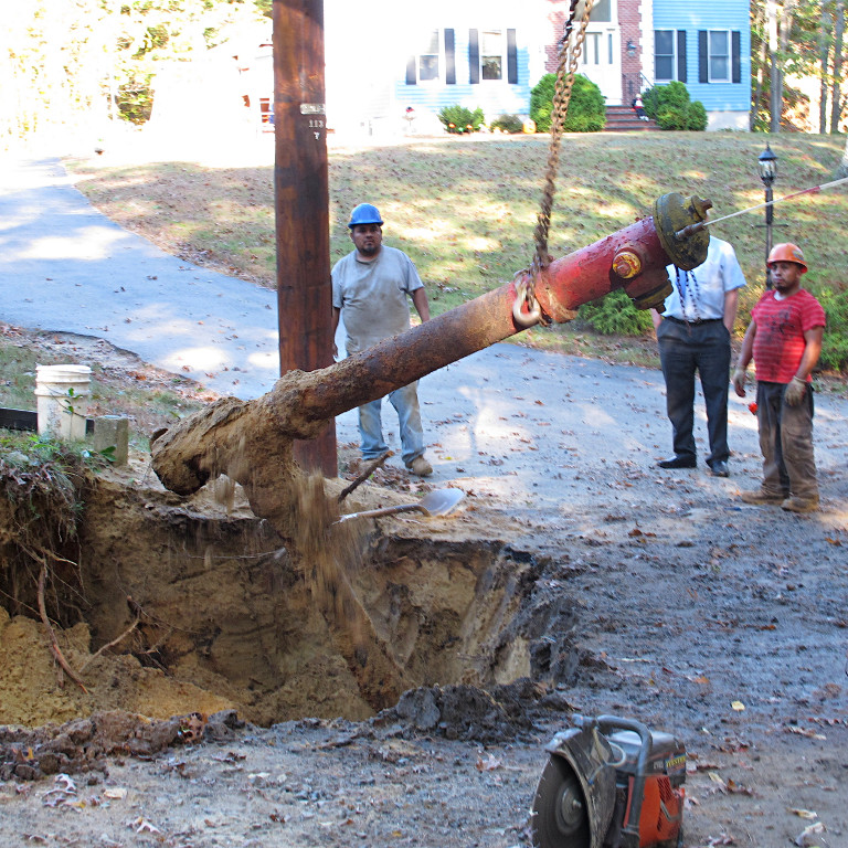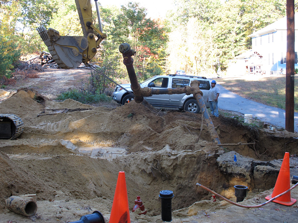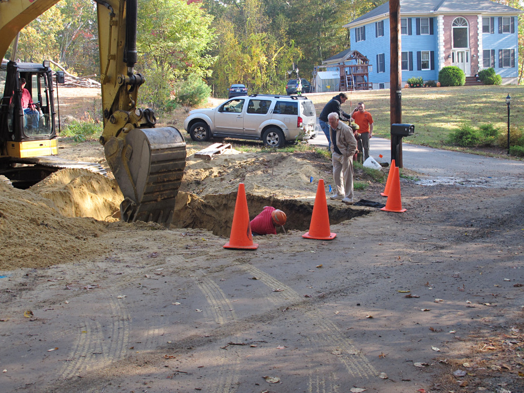 Not only was the old pipe in good shape on the outside, it was almost pristine on the inside too. Roman aqueducts aside, for a vintage-1956 or so installation in cast iron that's kind of amazing. No inordinate deposits or corrosion, and likely no concerns about future capacity with a healthy six-inch main feeding relatively few houses along this stretch. And they were about to join up *two* six-inch mains around the loop which would then both combine to feed the subdivision, increasing the net capacity to this point and adding redundancy to the system as well. |