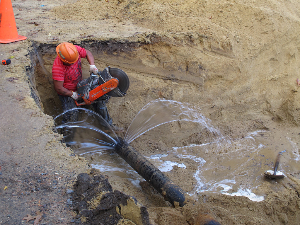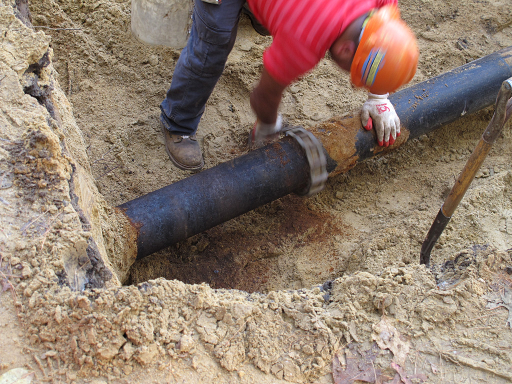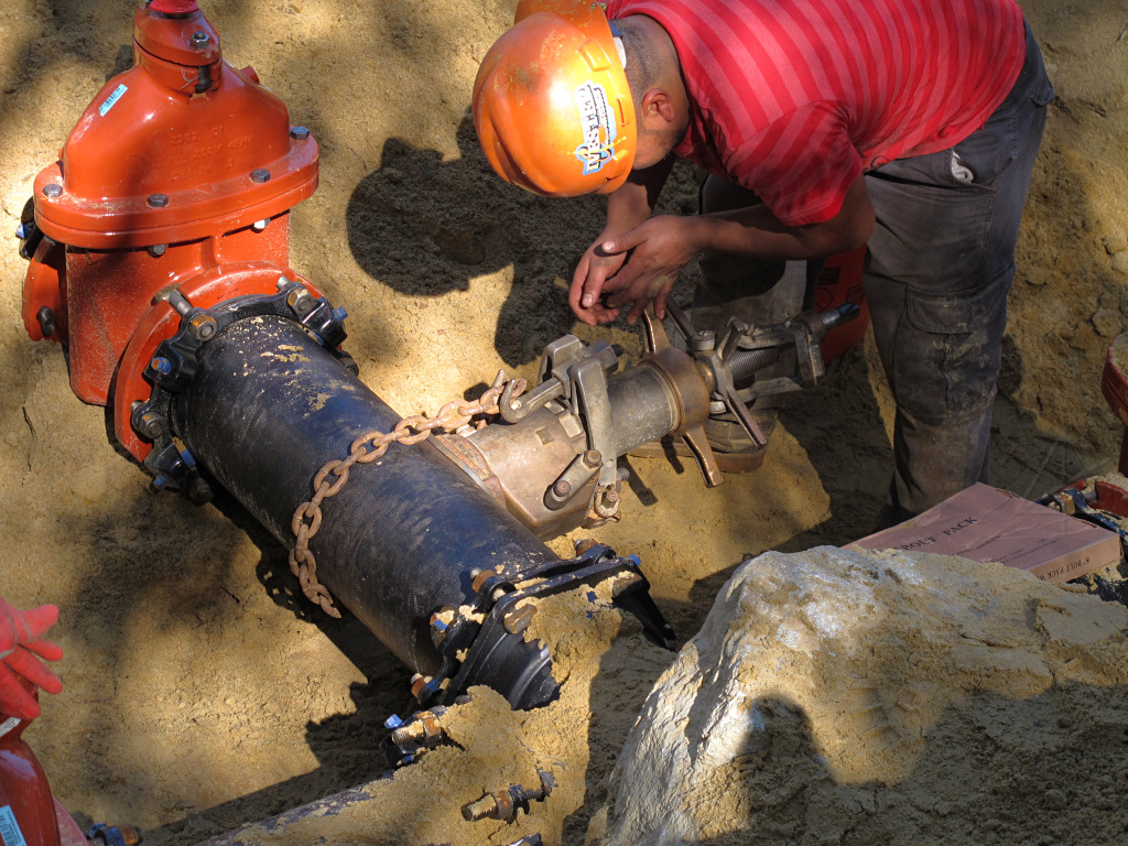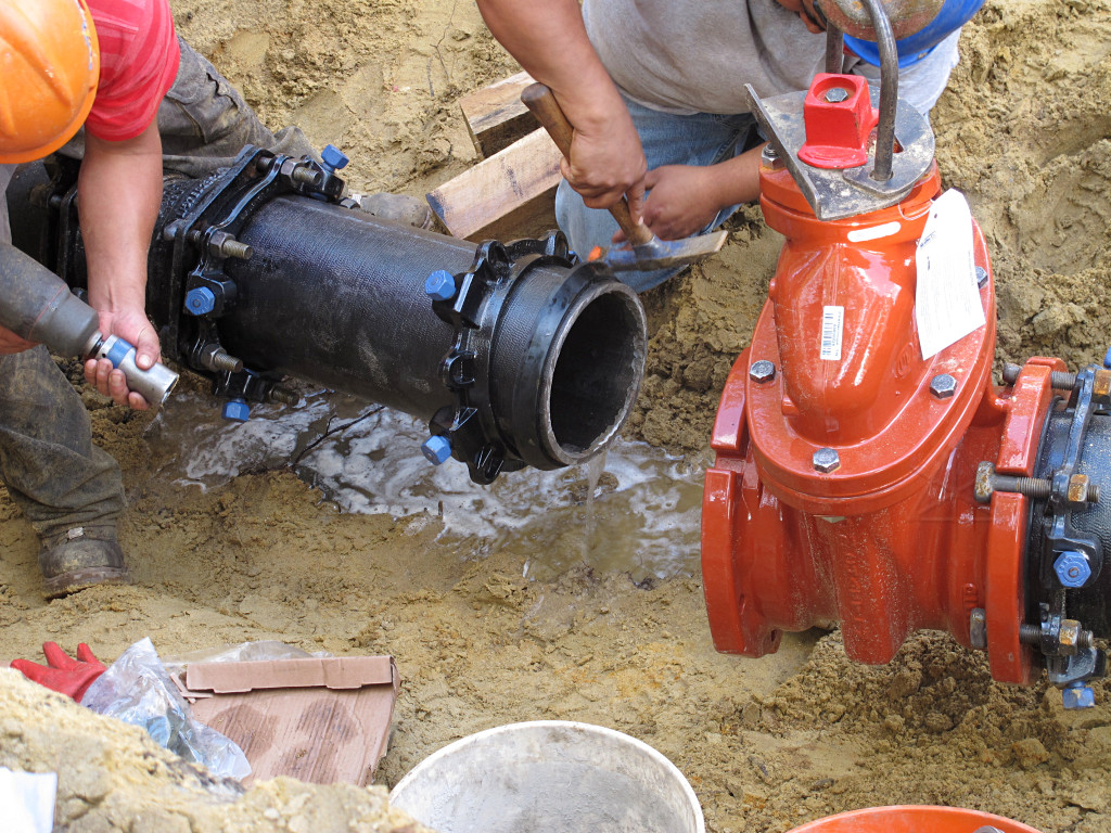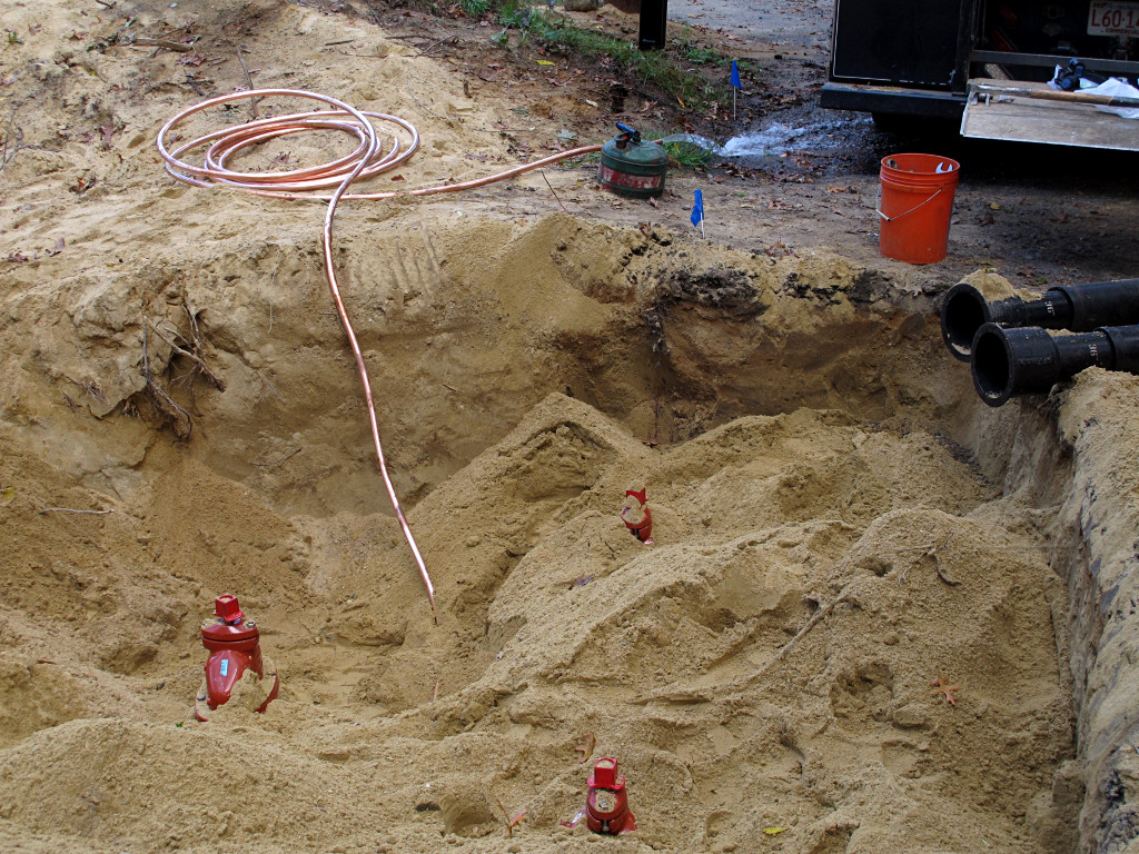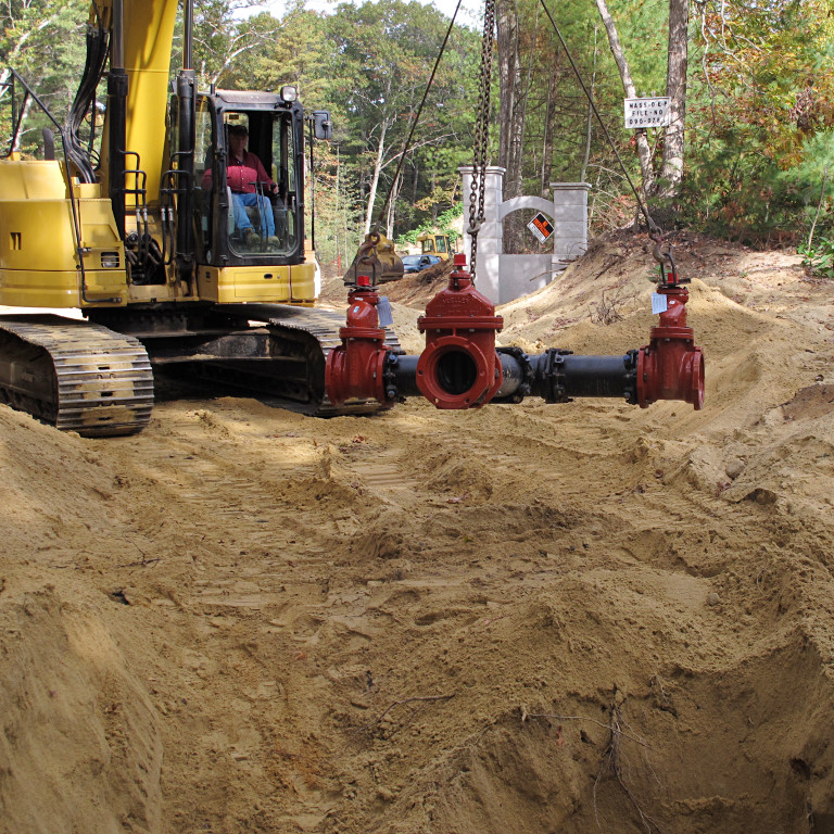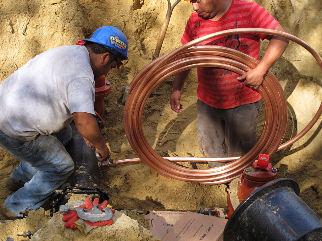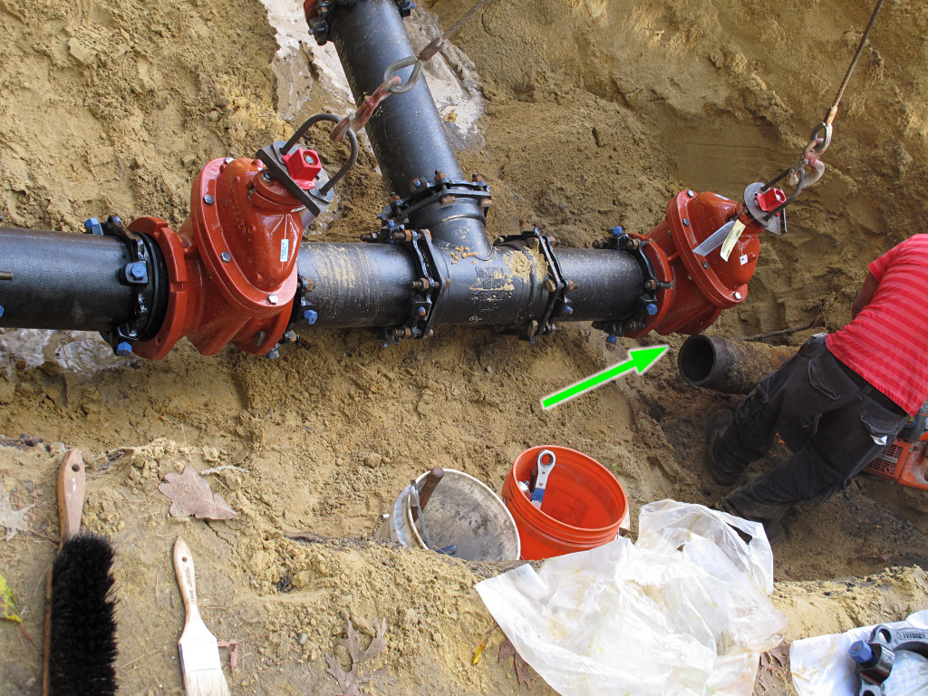 To align the stem of the tee with where they needed the subdivision supply pipe to go, they added a two-foot nipple before going into the valve. |
