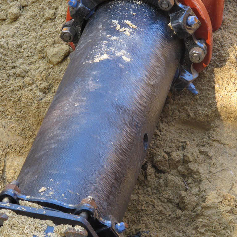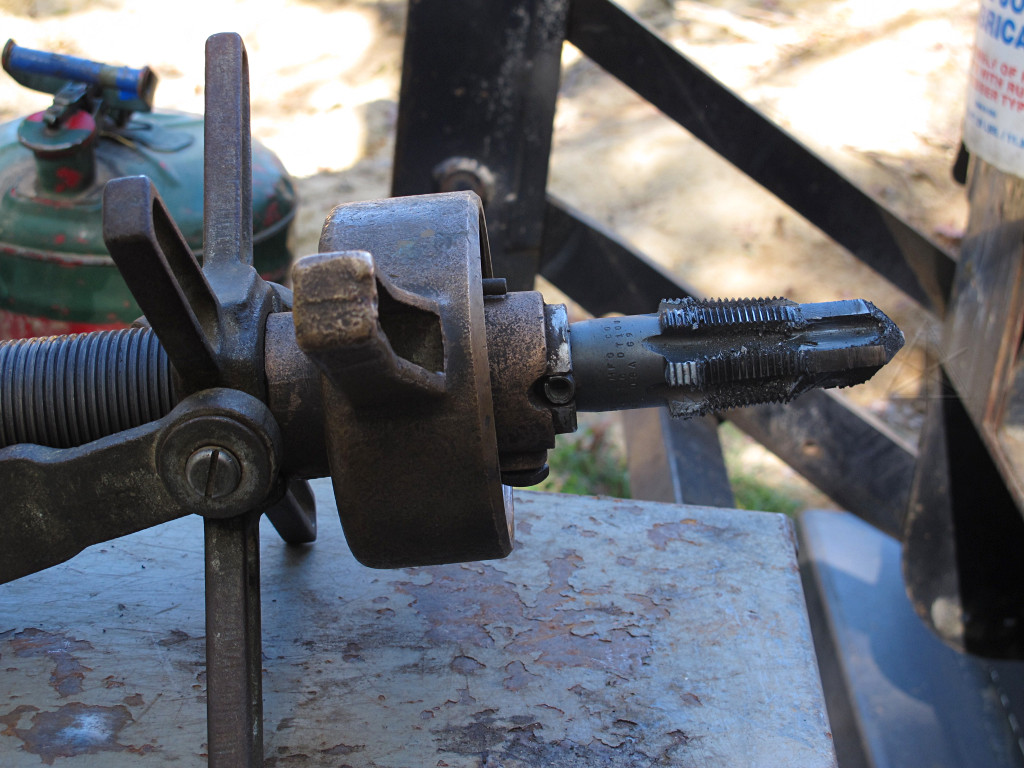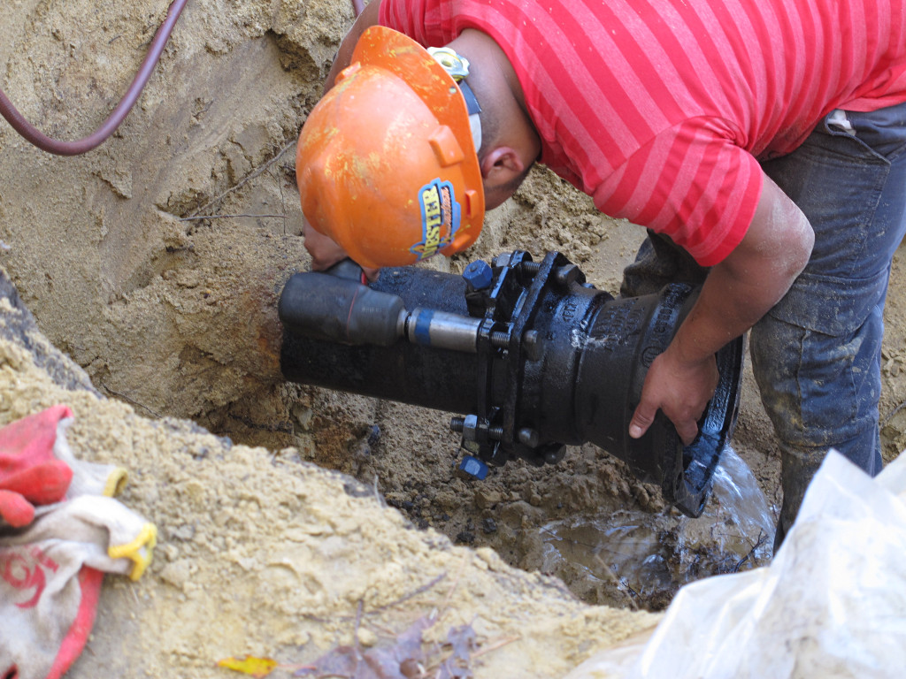 They decided to bring that home's service off the middle of the T since it was handily exposed here, using a fitting called a corporation stop. This would be a nice demo of how subscribers typically get tied into a water main. A drilling jig is chained around the pipe, which guides a special bit that drills and taps a hole in one operation. |