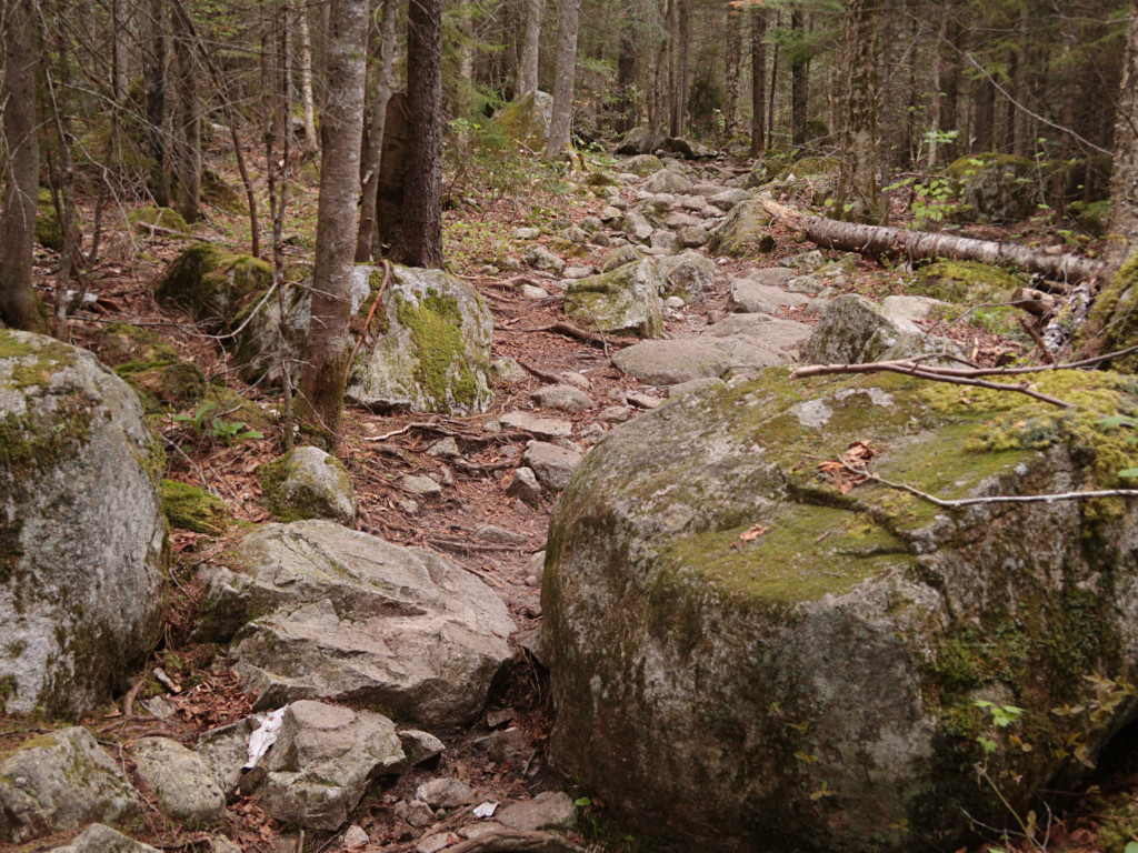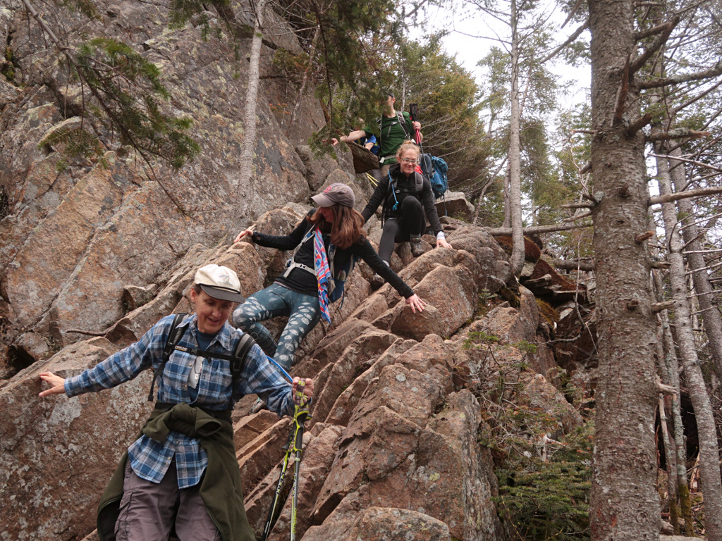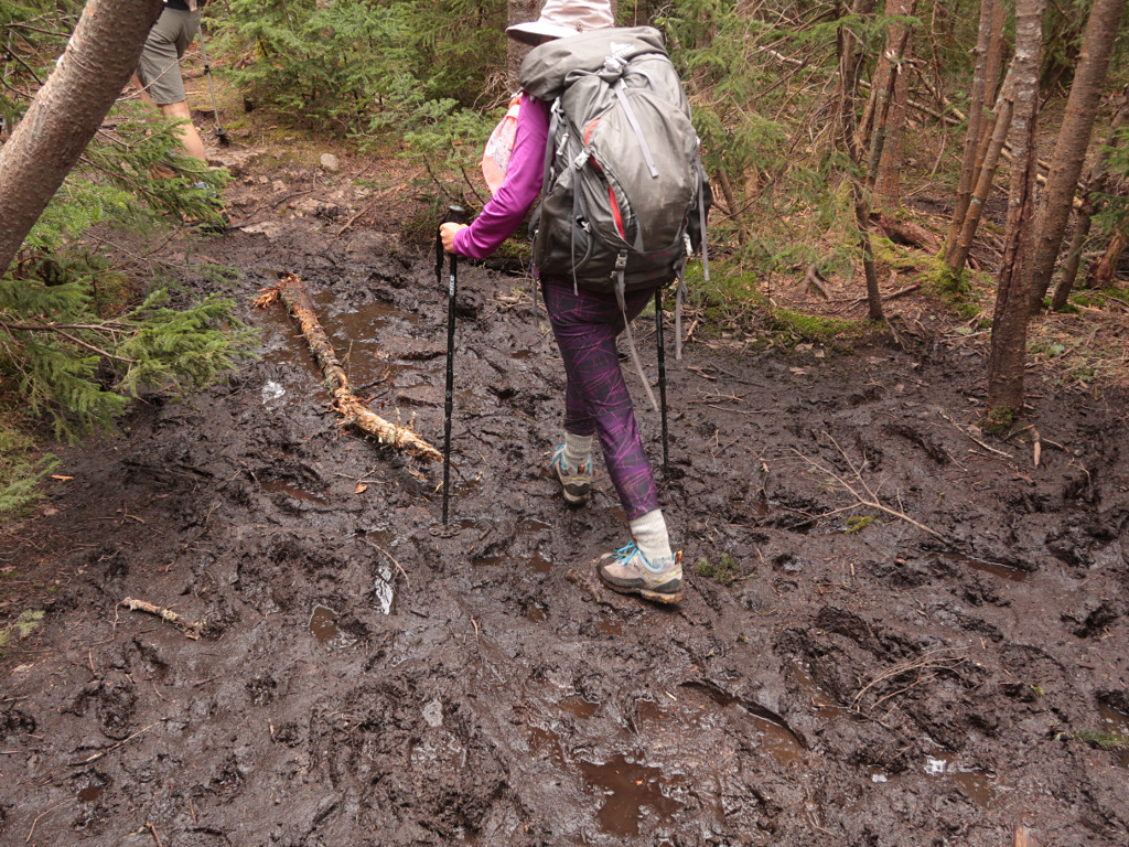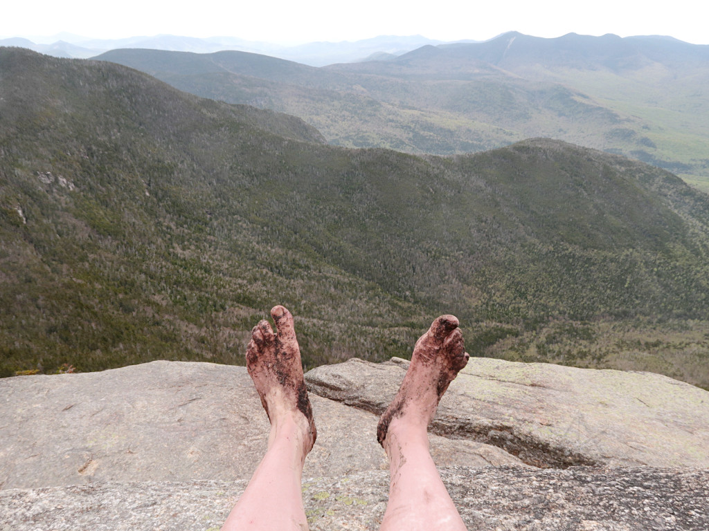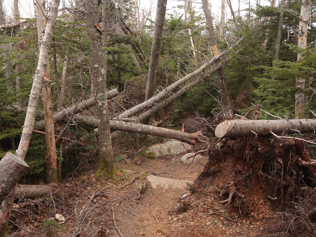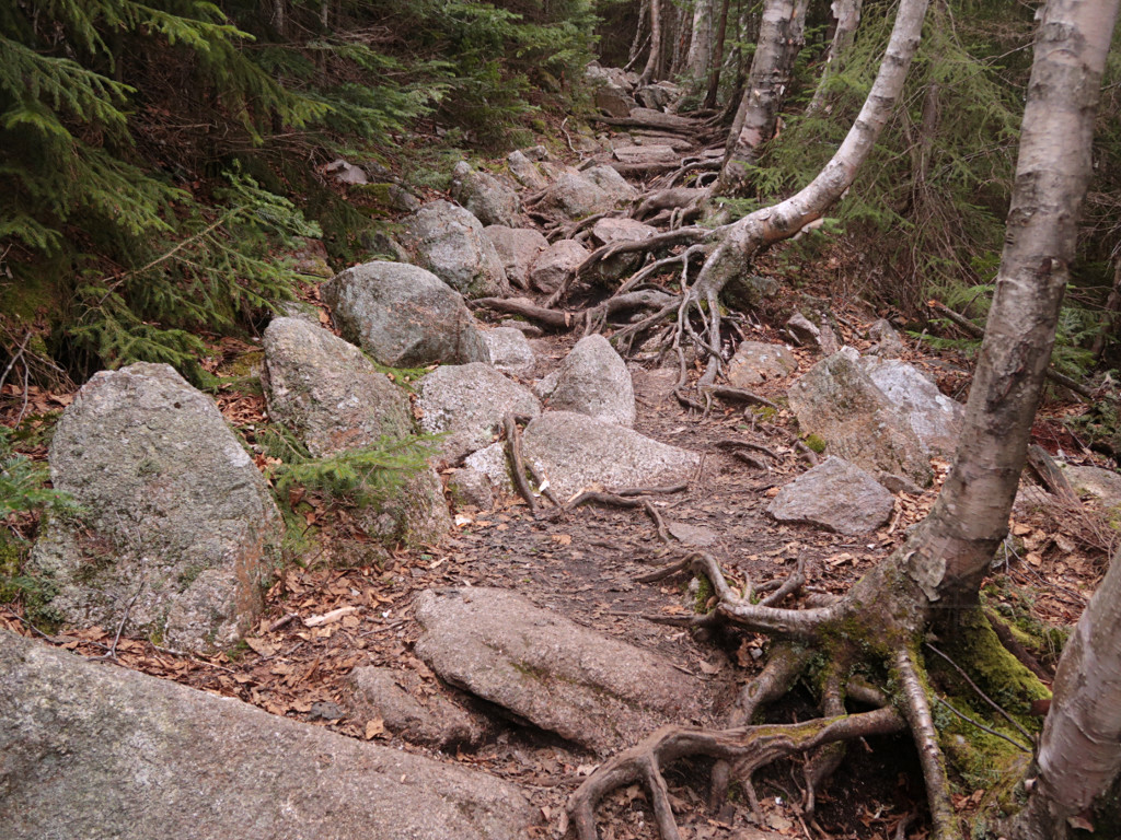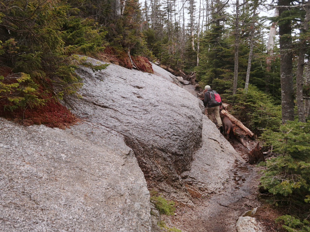 I walked with them for a little while and chatted with the leader about various stuff, from other barefooting adventures to internal AMC committee machinations to the joys of "mud season", but then opted to keep going more briskly ahead of them and perhaps re-connect at the summit. The AMC hike had left bagging East Osceola, the additional peak a mile or so farther along, as an option depending on how the group felt -- and I figured I'd evaluate my own state before making that decision as well, and maybe accompany them on that piece of it. |