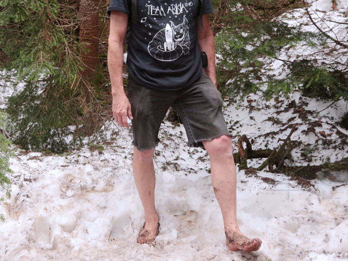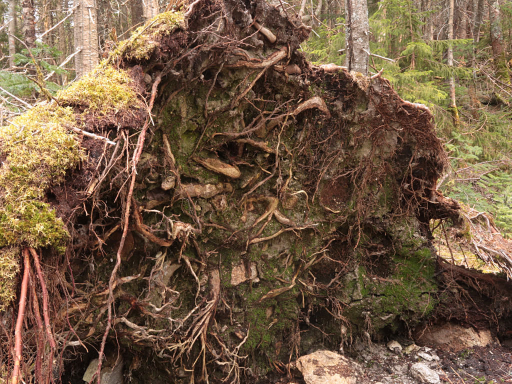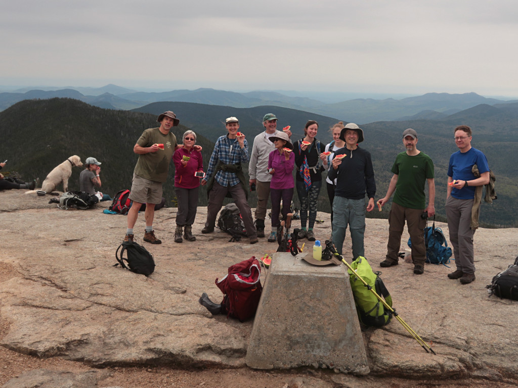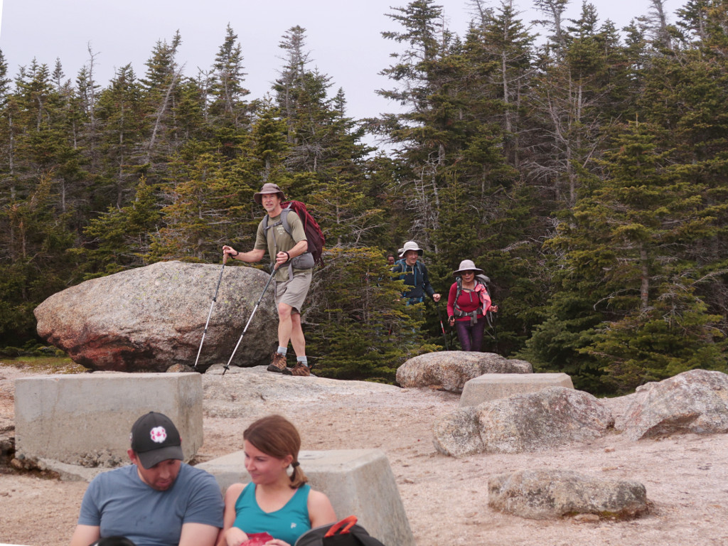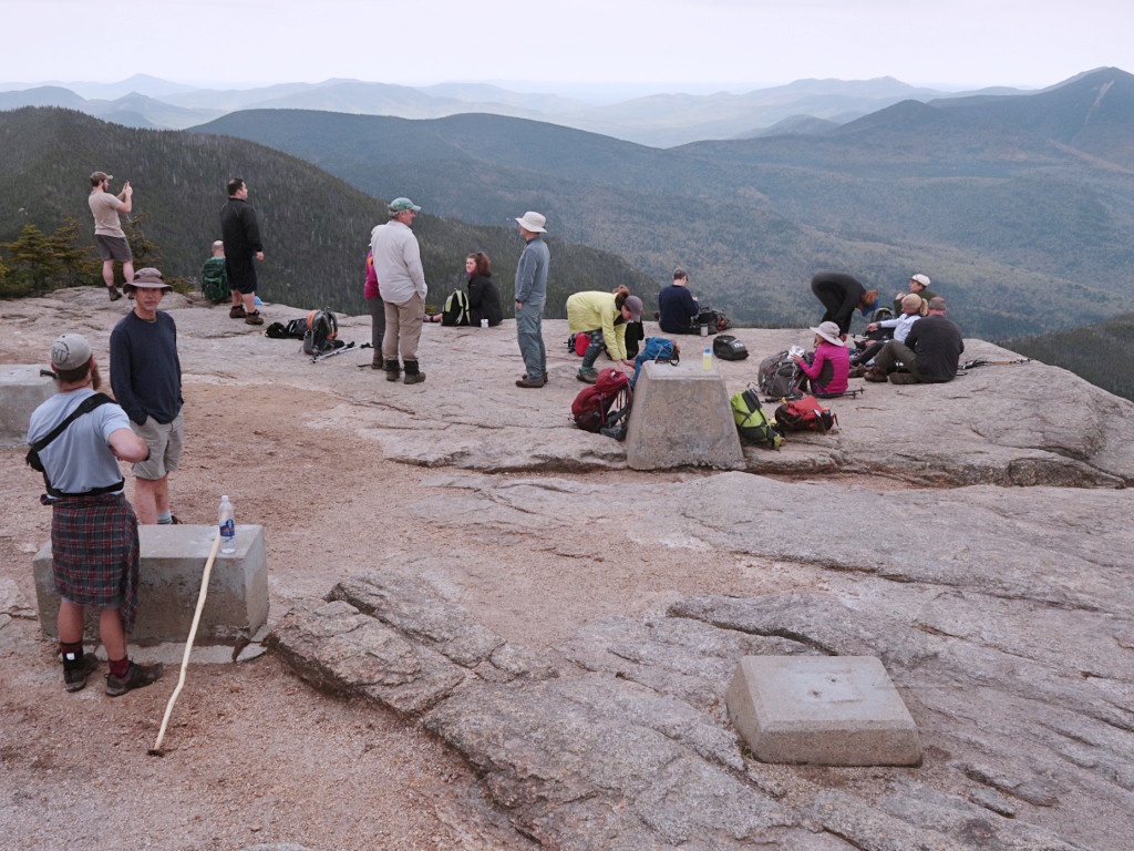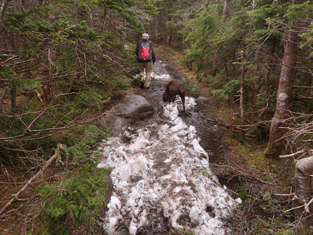 As things leveled out shortly before the summit, we found some leftover snow! Not exactly "monorail" as it was all rather soft, but entertaining to slog through especially considering it was still here in June. It was familiar because I'd been on some of our local smaller-scale monorail equivalent during my winter Fells hike that year, over frozen sections mashed down and solidified by other hikers, where I observed that temperature-equalized soles provide astoundingly good grip directly on ice. |