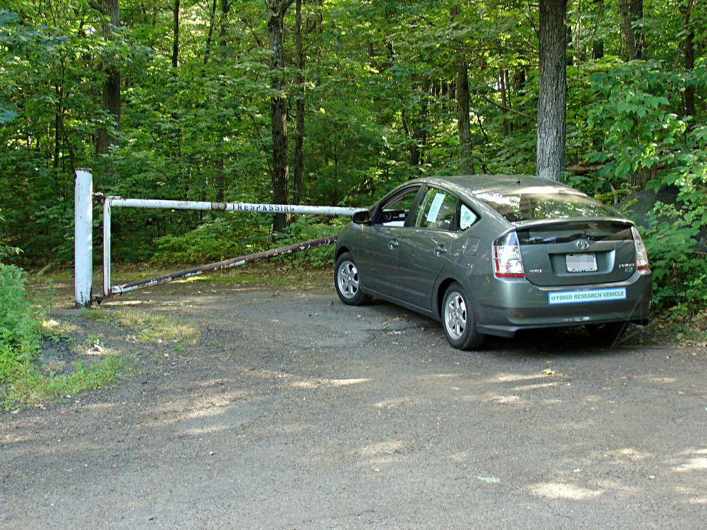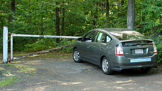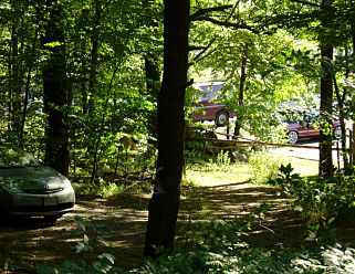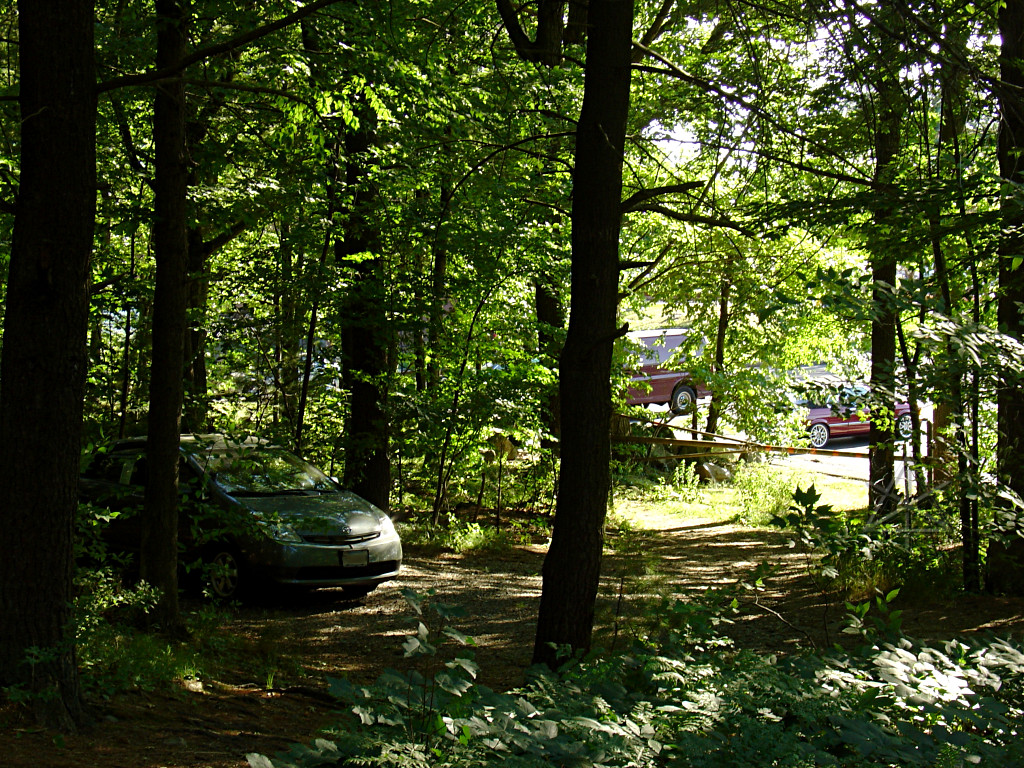Just before the turn away from corporate-land, there's a little gravel offshoot and a gate into the back of one of their parking lots. That's my car, crouching stealthily in the dark, mysterious woods, ready to leap out on some unsuspecting Porsche. Actually, some guy came out as I was taking this and got into the red Beamer seen here and left, blathering on his cellphone the entire time.