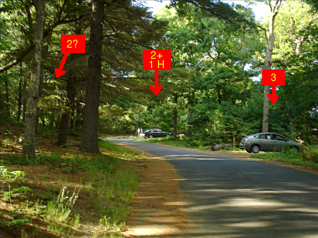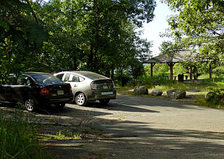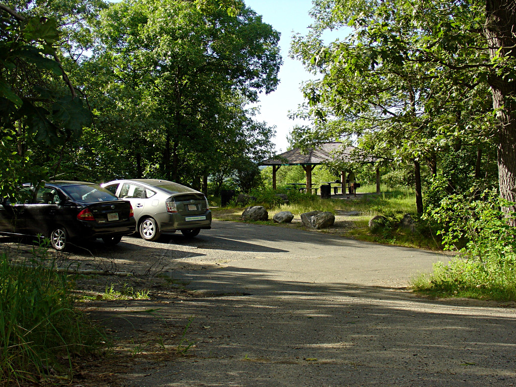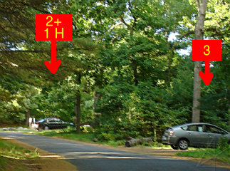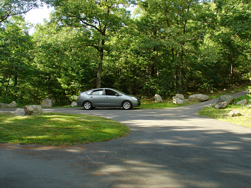 Up the hill a little more from the Far Turn [heading north, now] are a couple more parking areas, but very limited. The labels indicate number of marked slots, and in a pinch, a couple of cars might be able to slot into an unpaved flat area to the left.