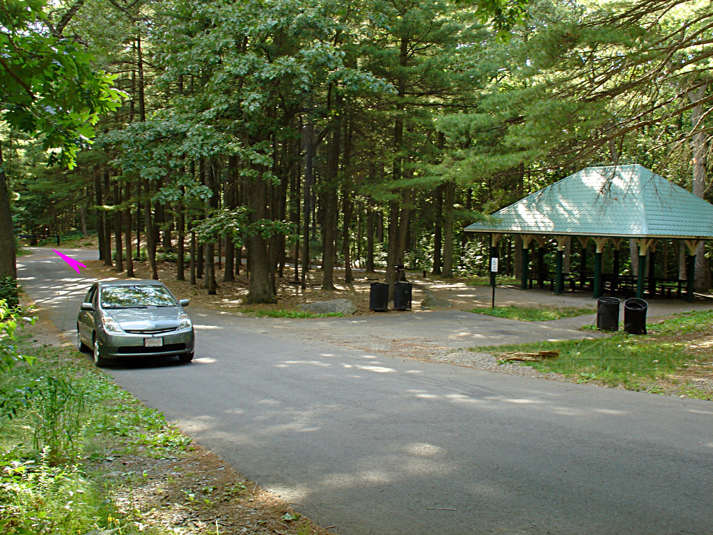 The southermost extremity of driveable road, looking southwest. The pink arrow behind where my car is points to yet another gate that bars access to the "emergency road" that exits the park at the southeast corner. There's another large picnic pavilion here, and another small building off to the right that I thought might be restrooms but doesn't actually seem like it.
