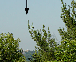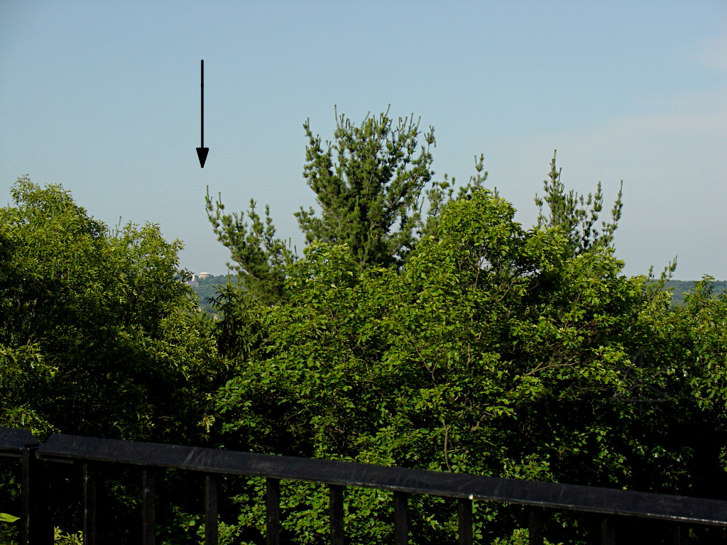 Looking slightly more to the northeast, I can spot the Arlington Heights water tower through a gap in the trees. That is pretty much the top of the hill where Rt. 2 crests and crosses Park Ave before the big warp-stealth scream down into Alewife. So that explains the lay of the land -- Prospect is far enough to the south that the other large hill doesn't get in the way of line-of-sight to Boston, and it's high enough here that smaller features in Belmont and Cambridge don't interfere.
